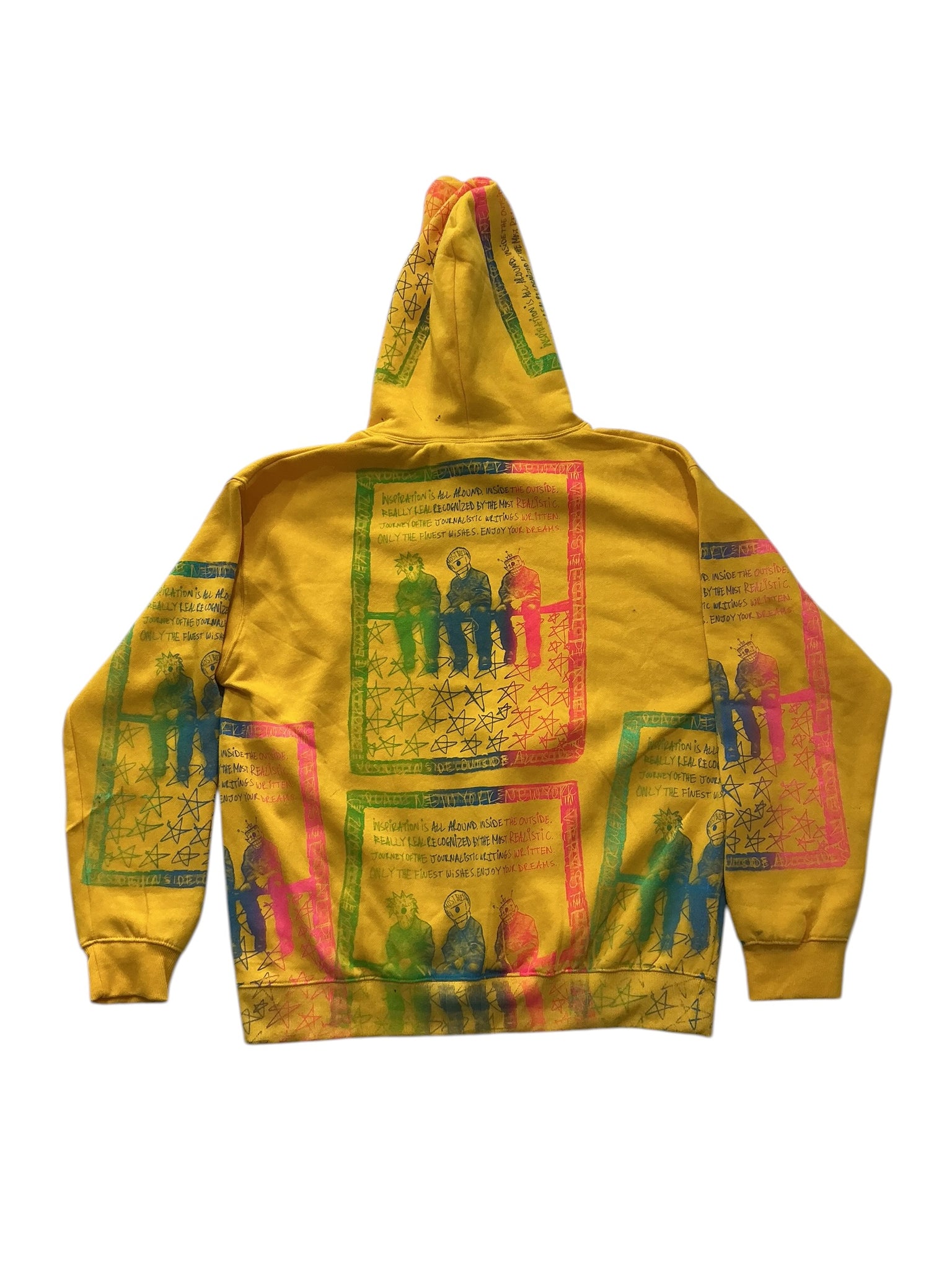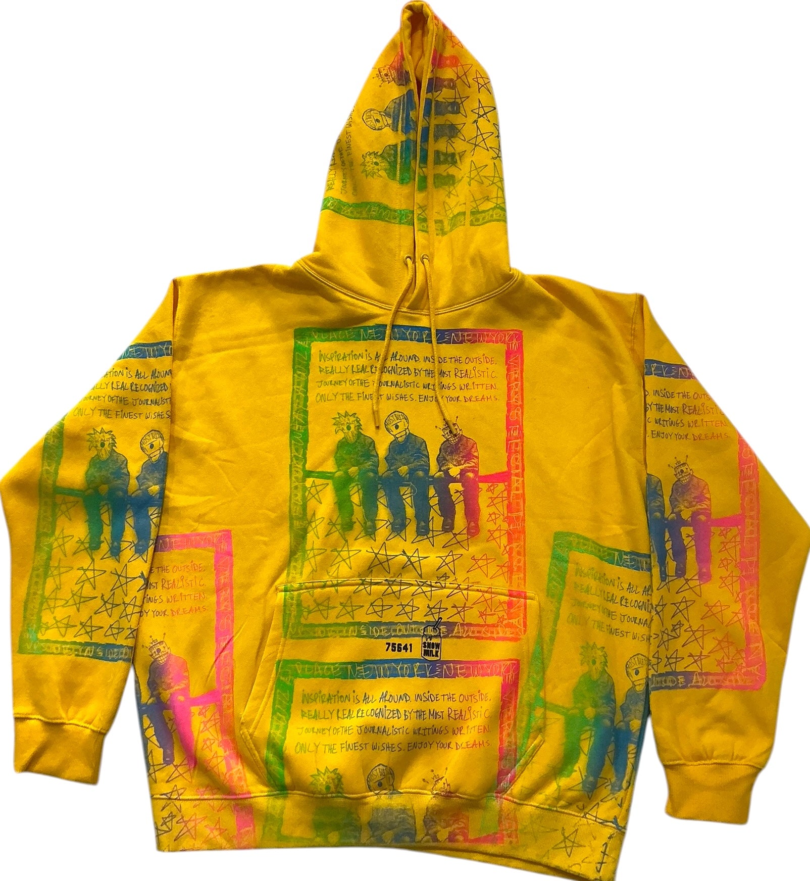 This is a one of a kind piece of clothing that has 3 characters sitting, a poem, and stars printed all over.