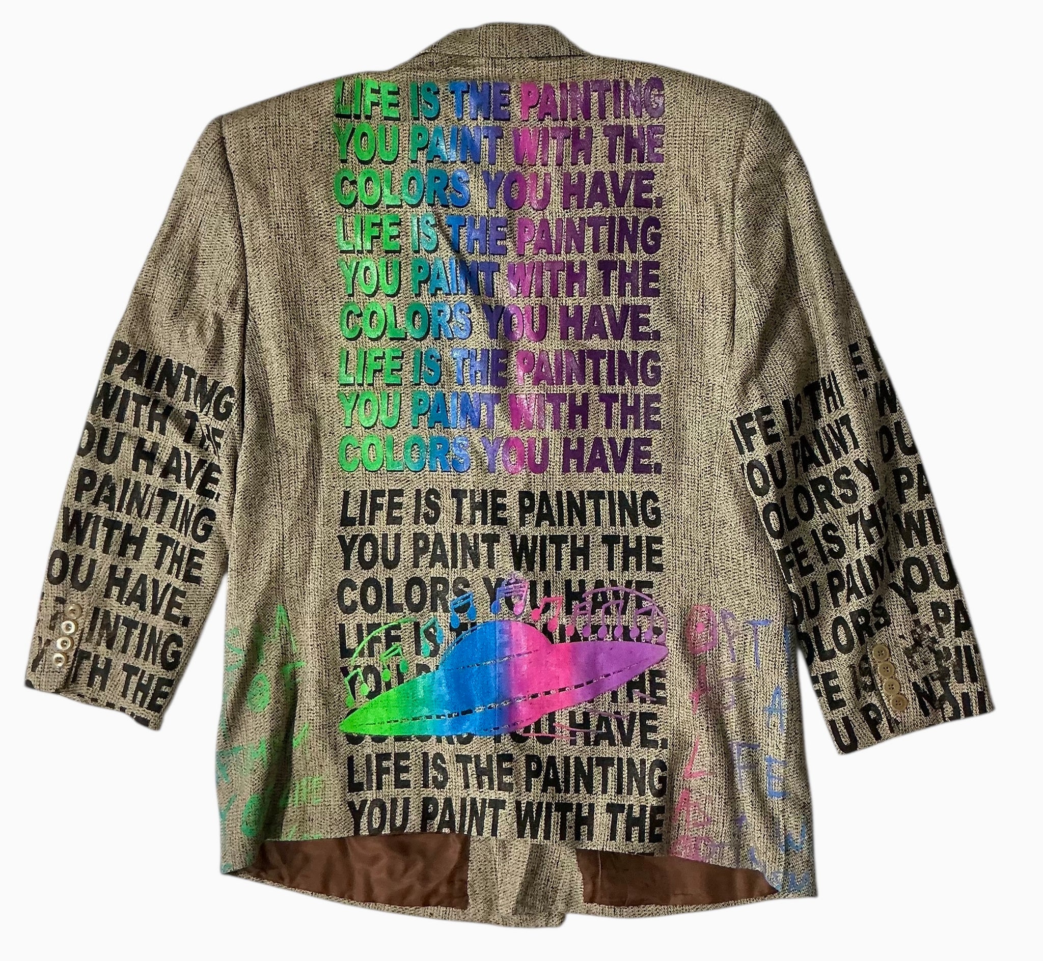 This is a one of a kind piece of clothing that has a spaceship and "Life is the painting you paint with the colors you have" printed all over the garment.