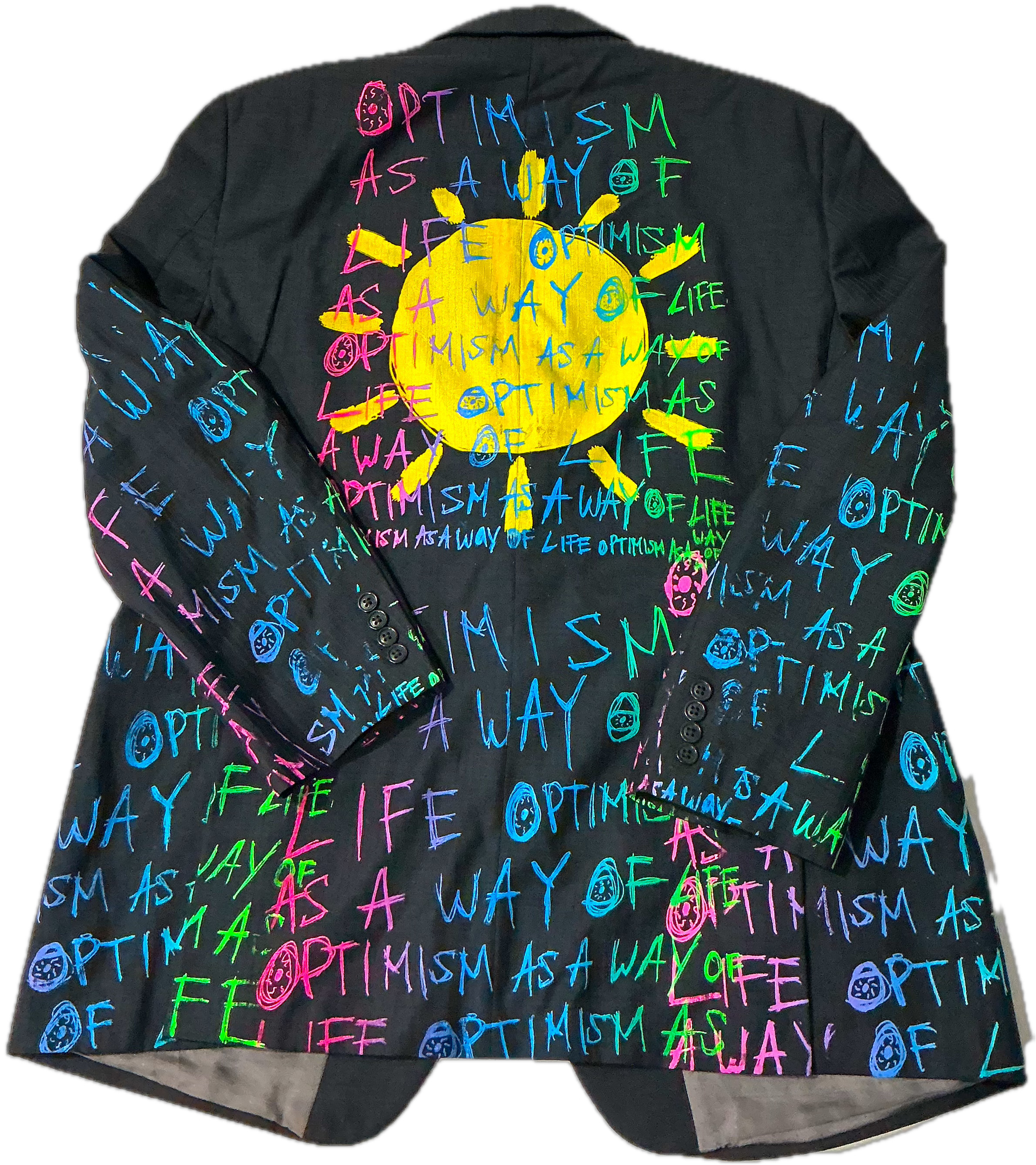 This is a one of a kind piece of clothing has a sun with optimism as a way of life printed all over.