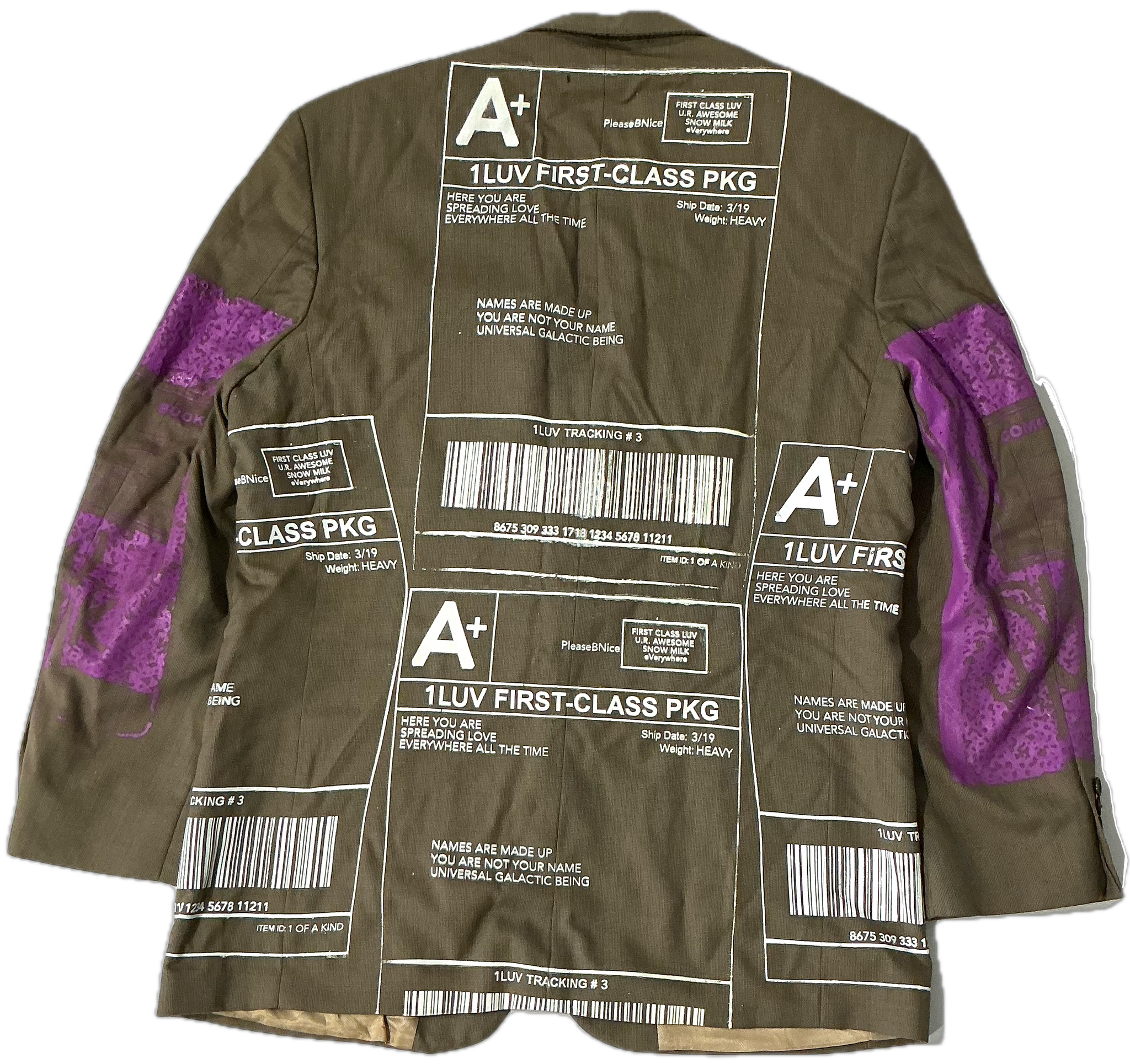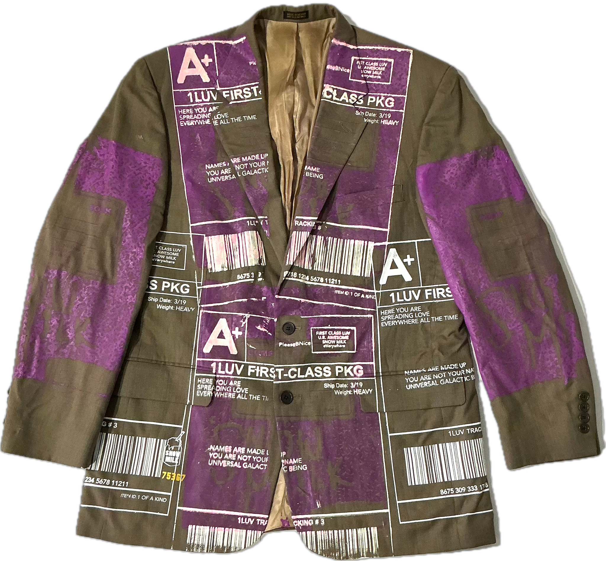 This is a one of a kind piece of clothing printed with and apple and the positive shipping label all over.