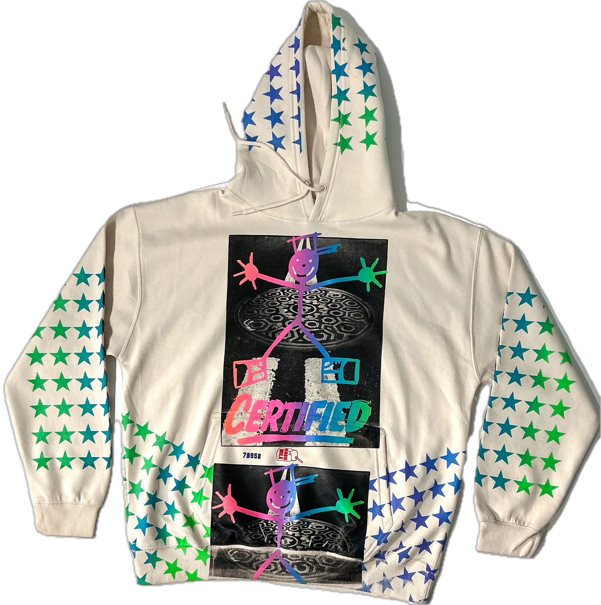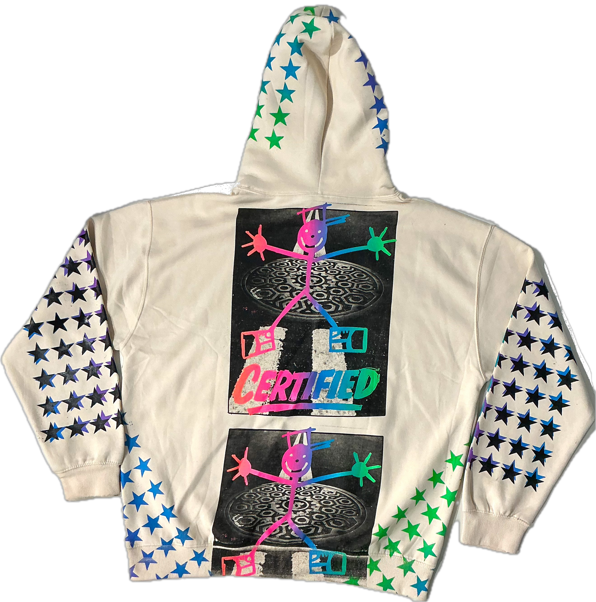 This is a one of a kind piece of clothing that has a picture of a street, stars, a stick man and Certified written all over the garment.