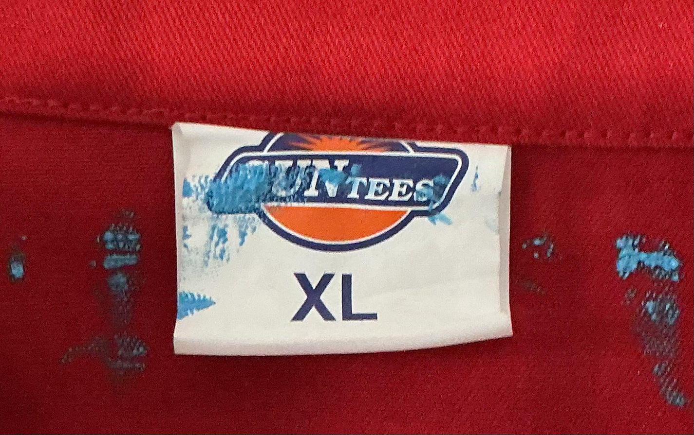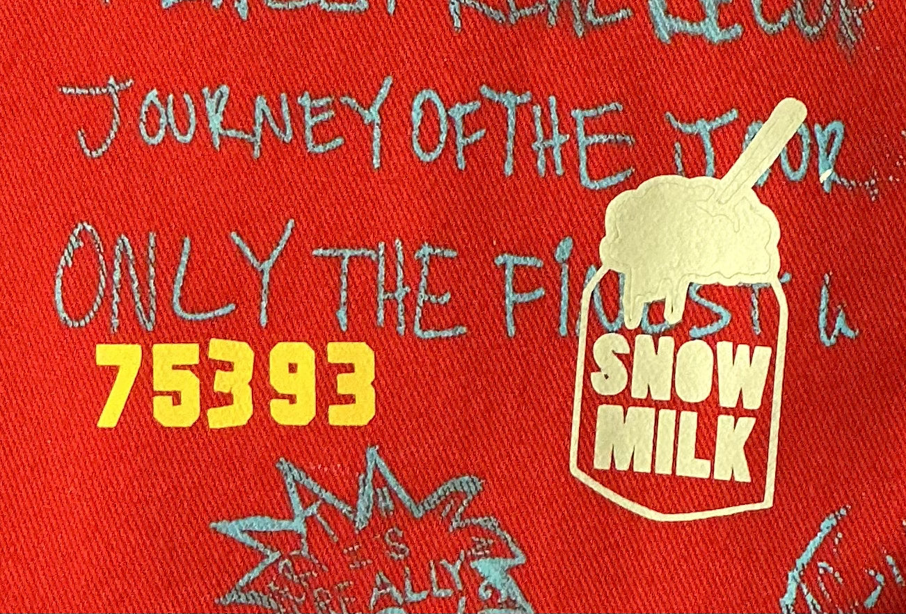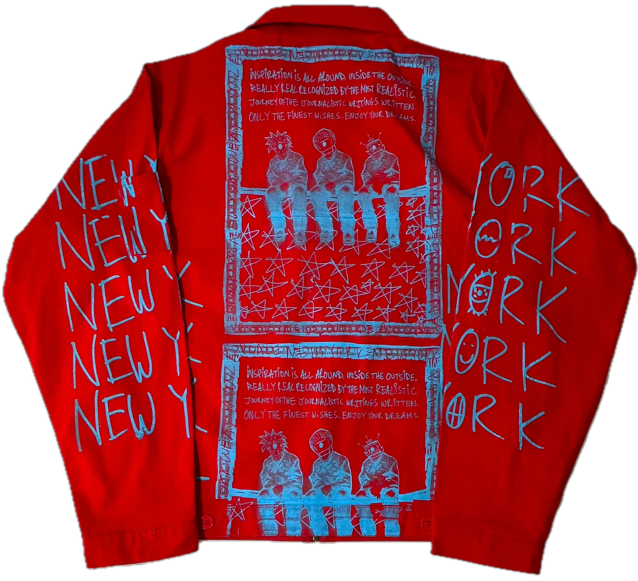 This is a one of a kind piece of clothing that has 3 characters sitting, a poem, and stars printed all over.