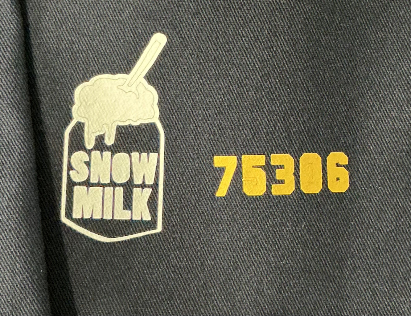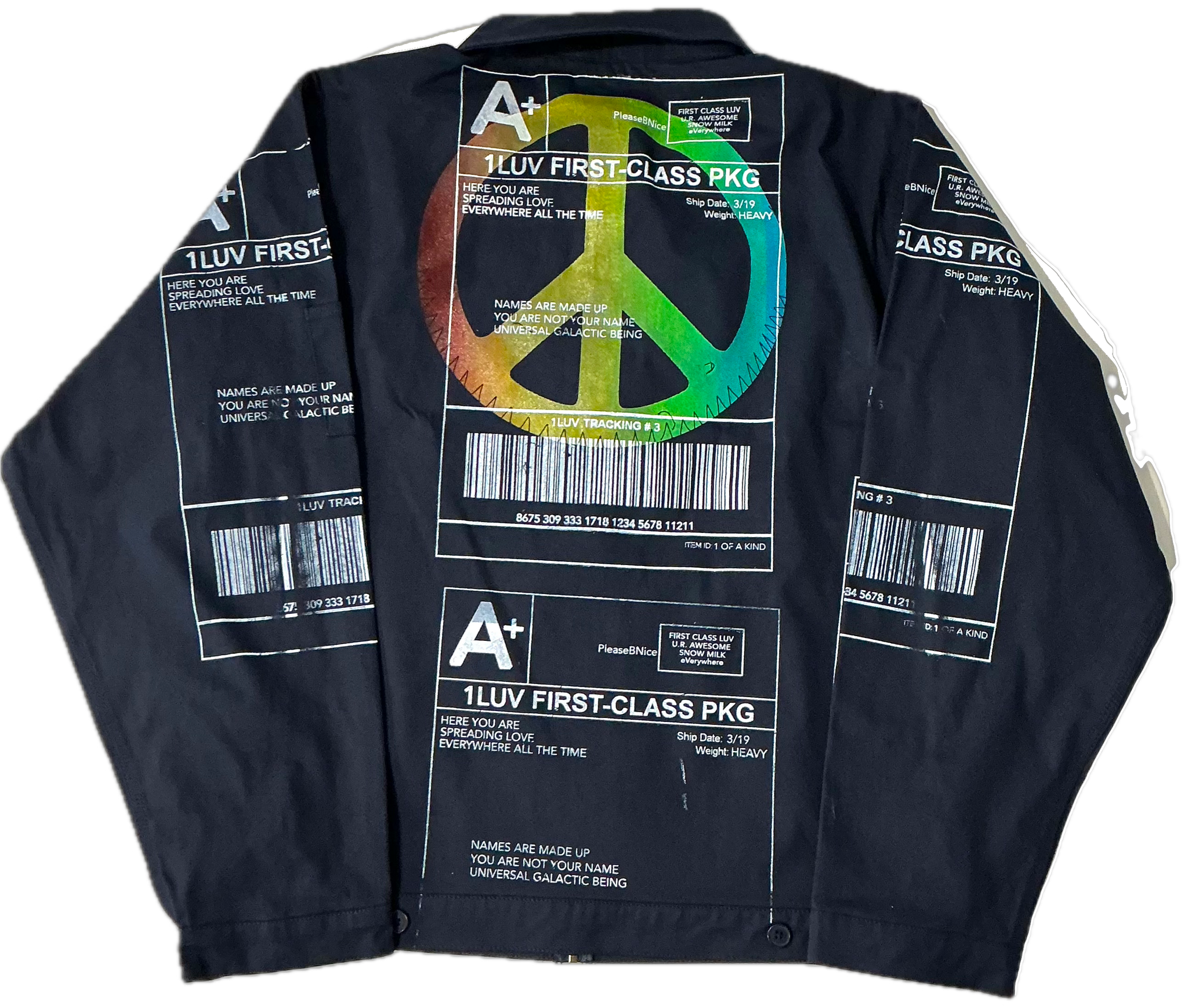 This is a one of a kind piece of clothing printed with and a peace sign and the positive shipping label all over.