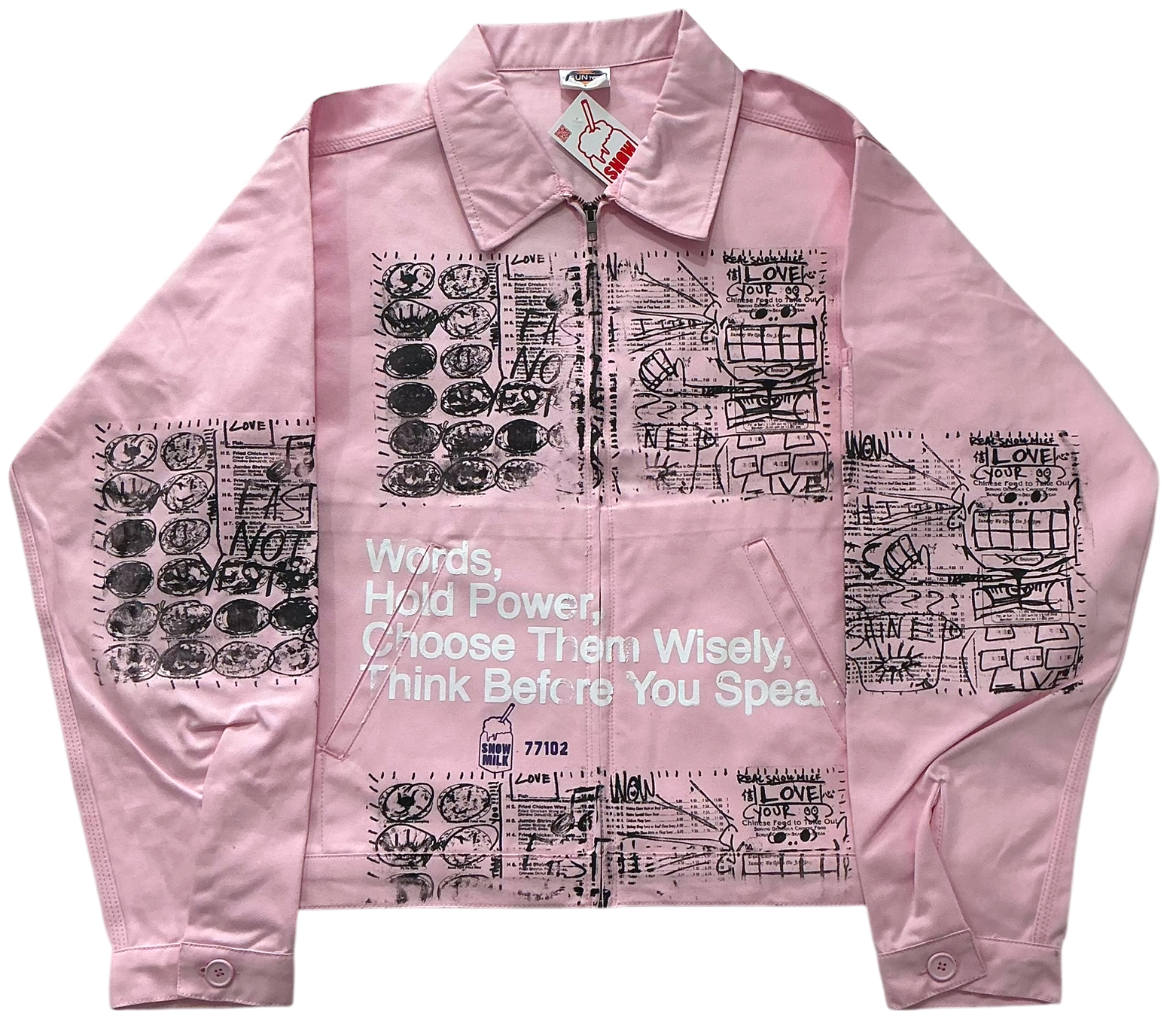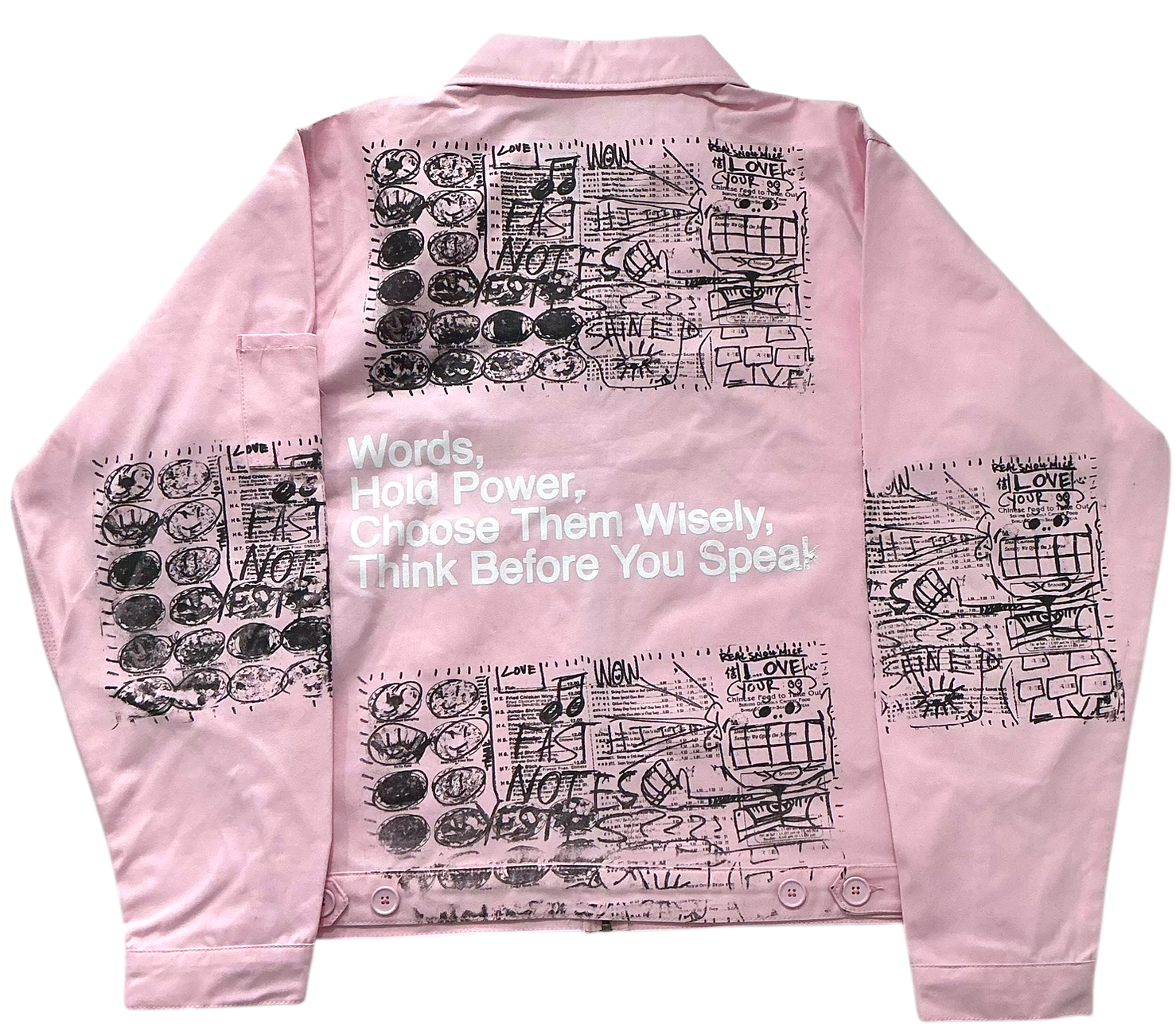 This is a one of a kind piece of clothing that has Words Hold Power printed all over the garment.