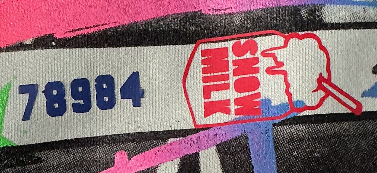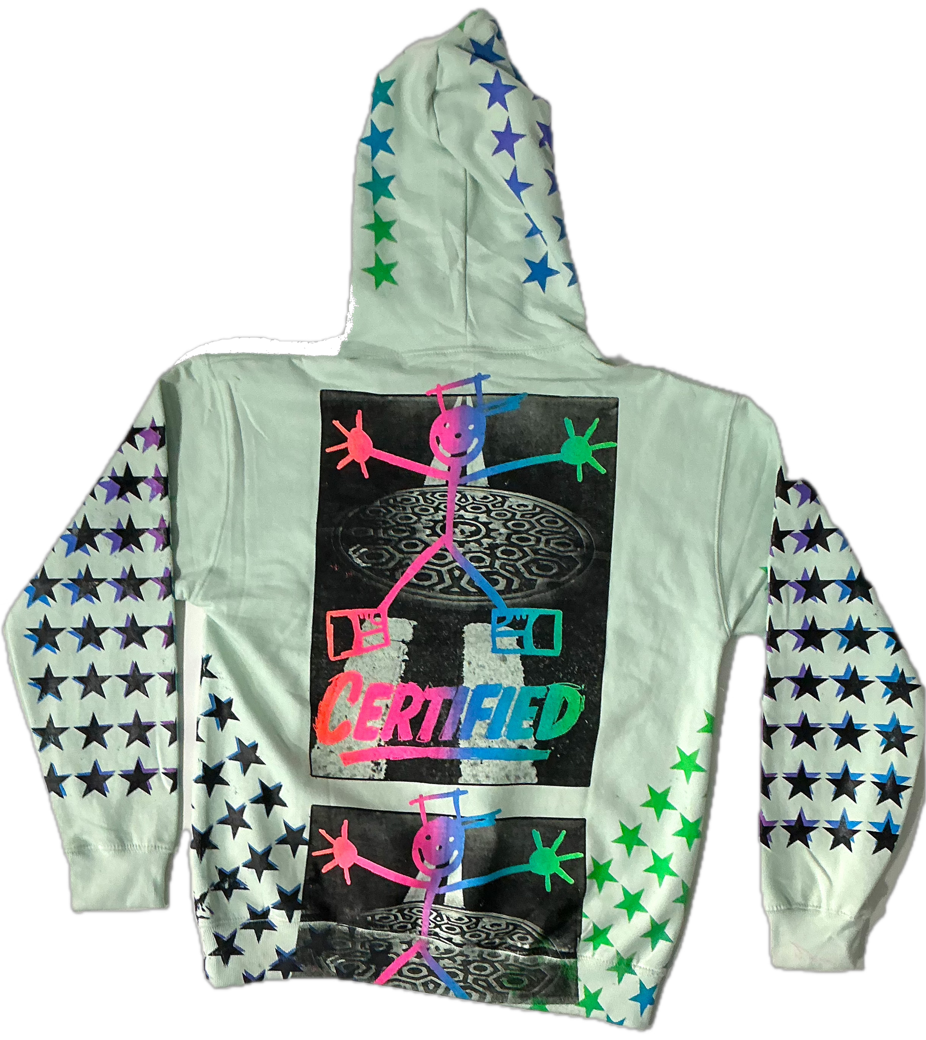 This is a one of a kind piece of clothing that has a picture of a street, stars, a stick man and Certified written all over the garment.