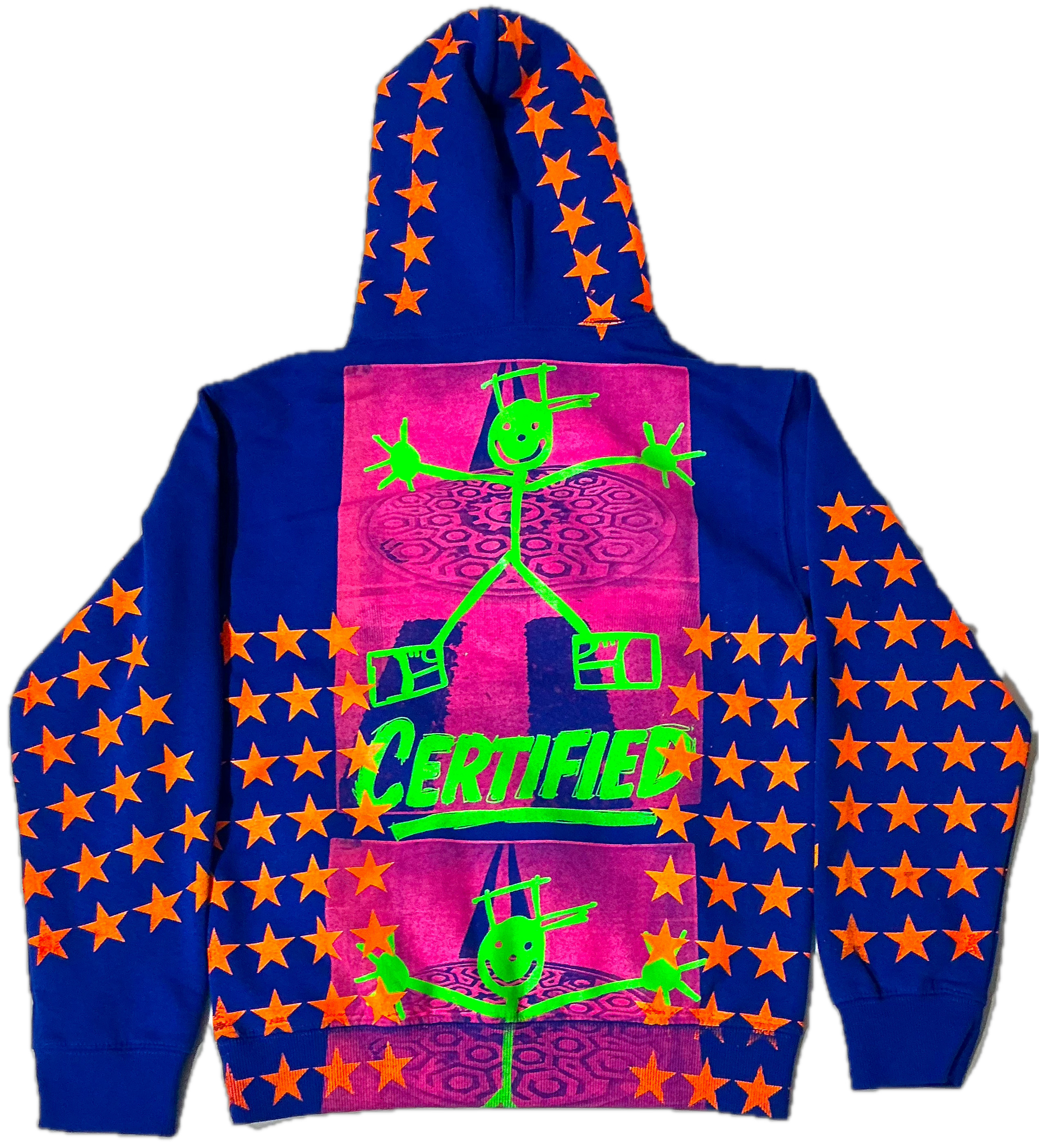 This is a one of a kind piece of clothing that has a picture of a street, stars, a stick man and Certified written all over the garment.