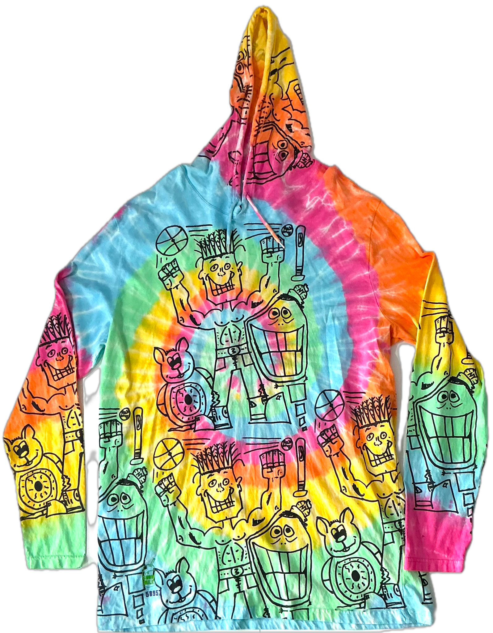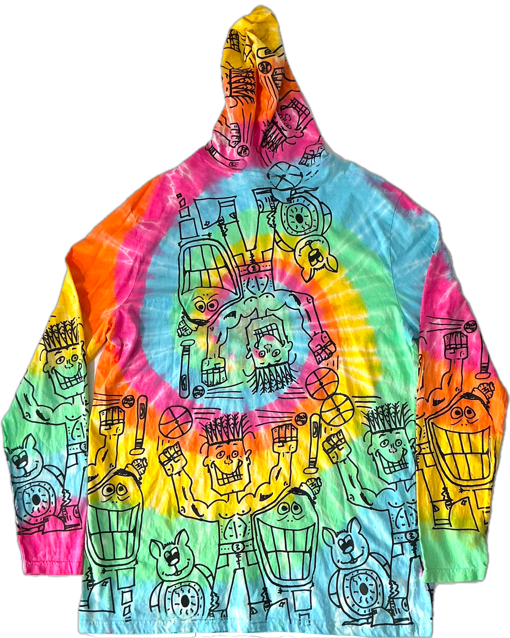 These are one of a kind pieces of clothing that were hand picked from the thrift store and then printed on. They have a vintage awesome feel and have kid like drawings printed all over.