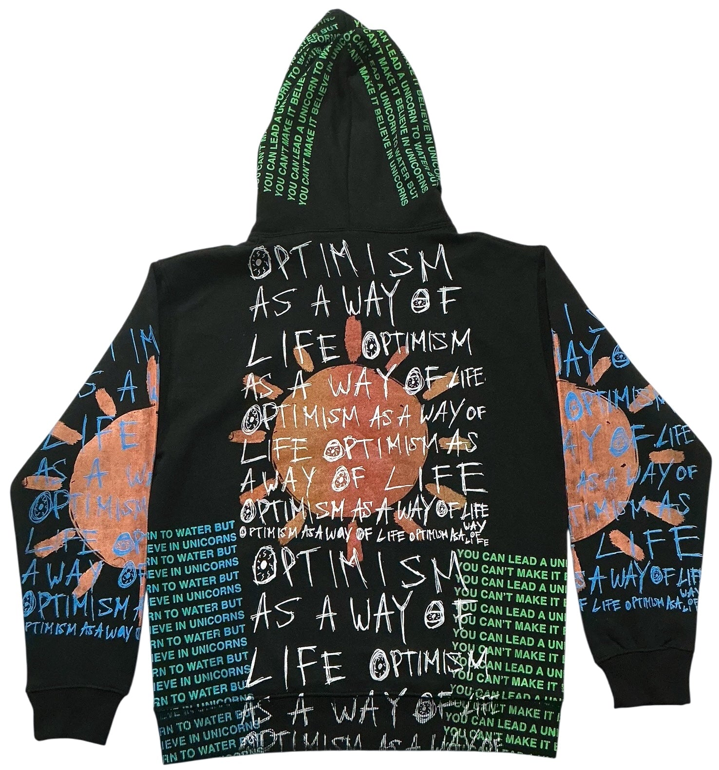 This is a one of a kind piece of clothing has a sun with optimism as a way of life printed all over.