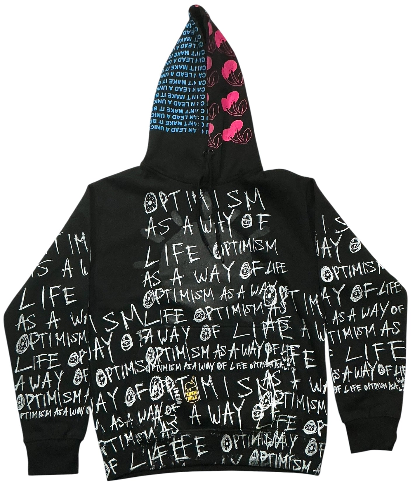 This is a one of a kind piece of clothing has a sun with optimism as a way of life printed all over.