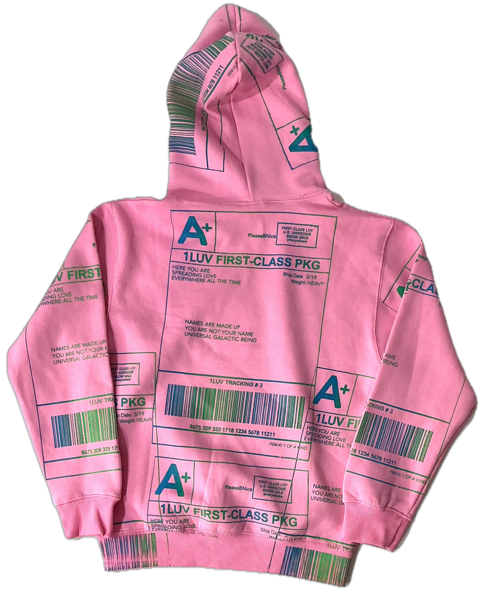 This is a one of a kind piece of clothing printed with the positive shipping label all over.