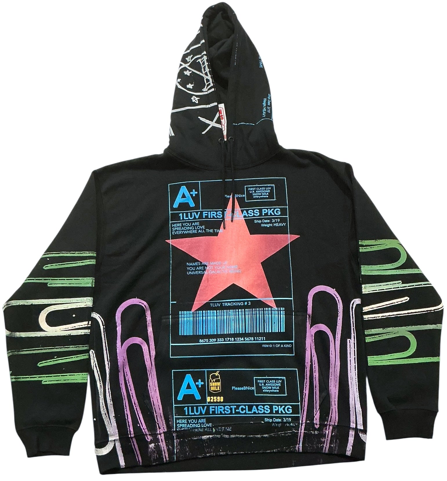 This is a one of a kind piece of clothing printed with the positive shipping label all over.