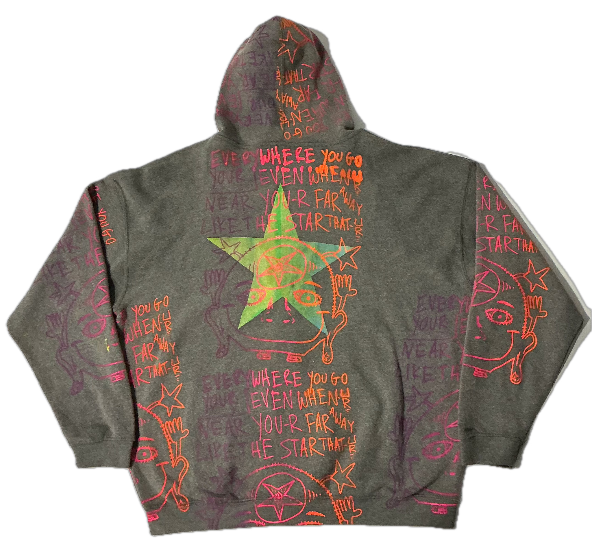 This is a one of a kind piece of clothing that has stars and a drawing of "Star That You Are" printed all over.