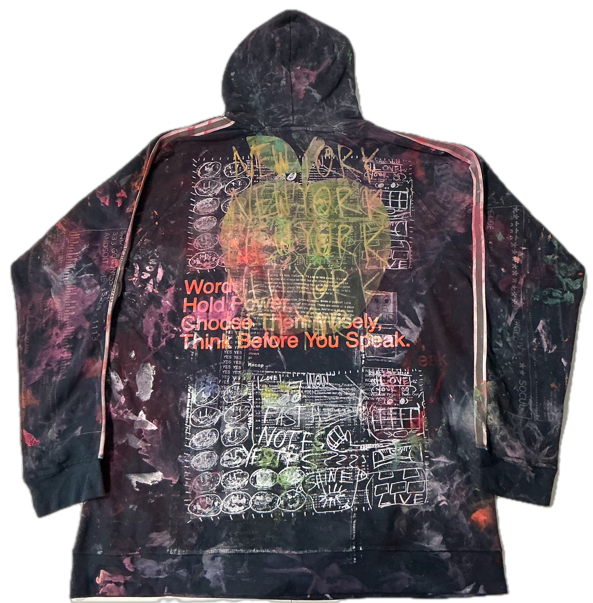 This is a one of a kind piece of clothing that has a peace sign, flowers, and Words Hold Power printed all over the garment.