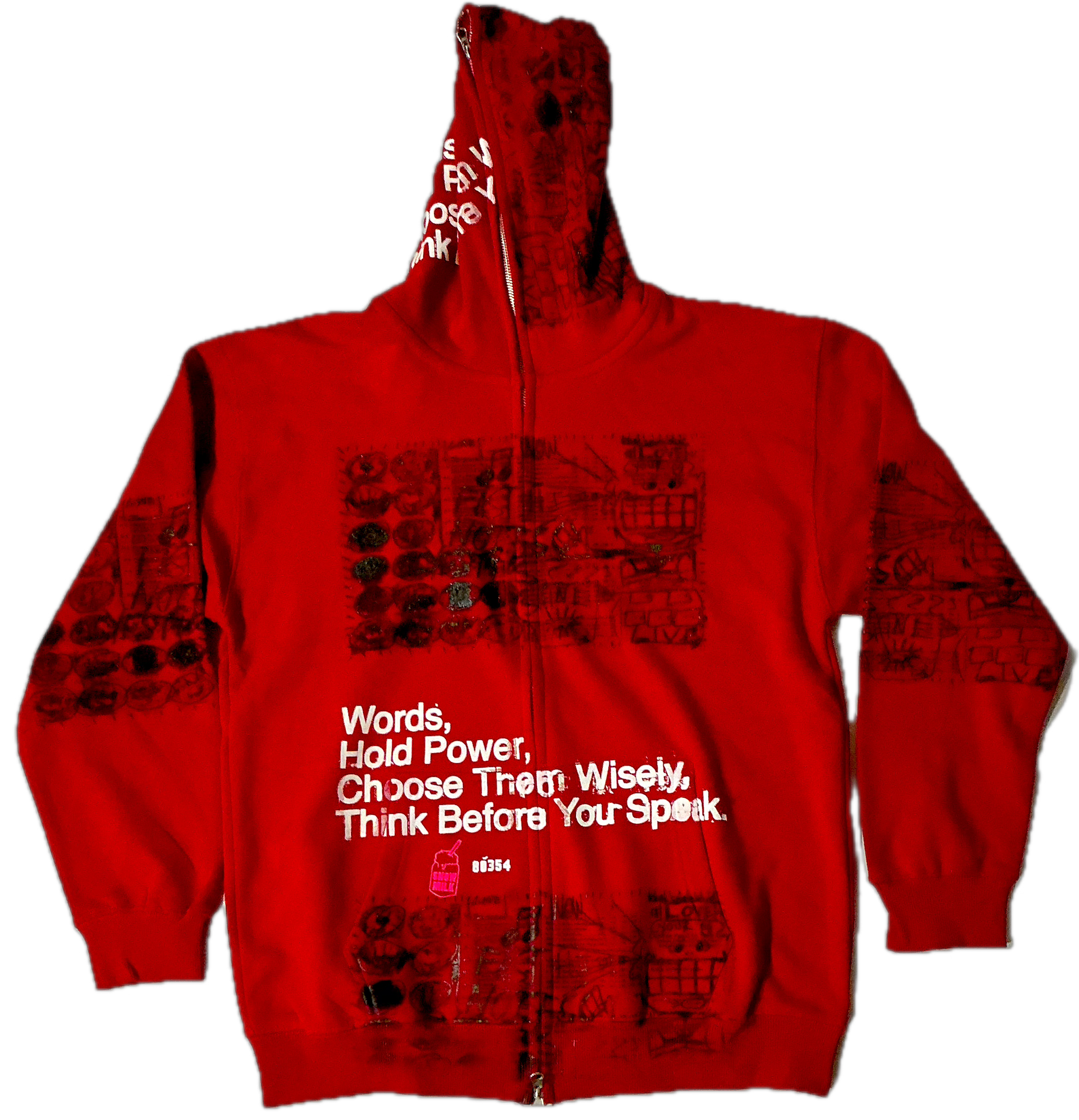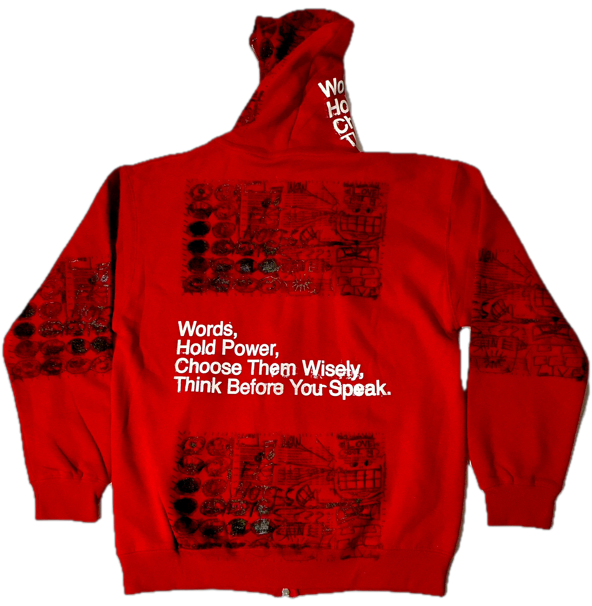 This is a one of a kind piece of clothing that has a peace sign, flowers, and Words Hold Power printed all over the garment.