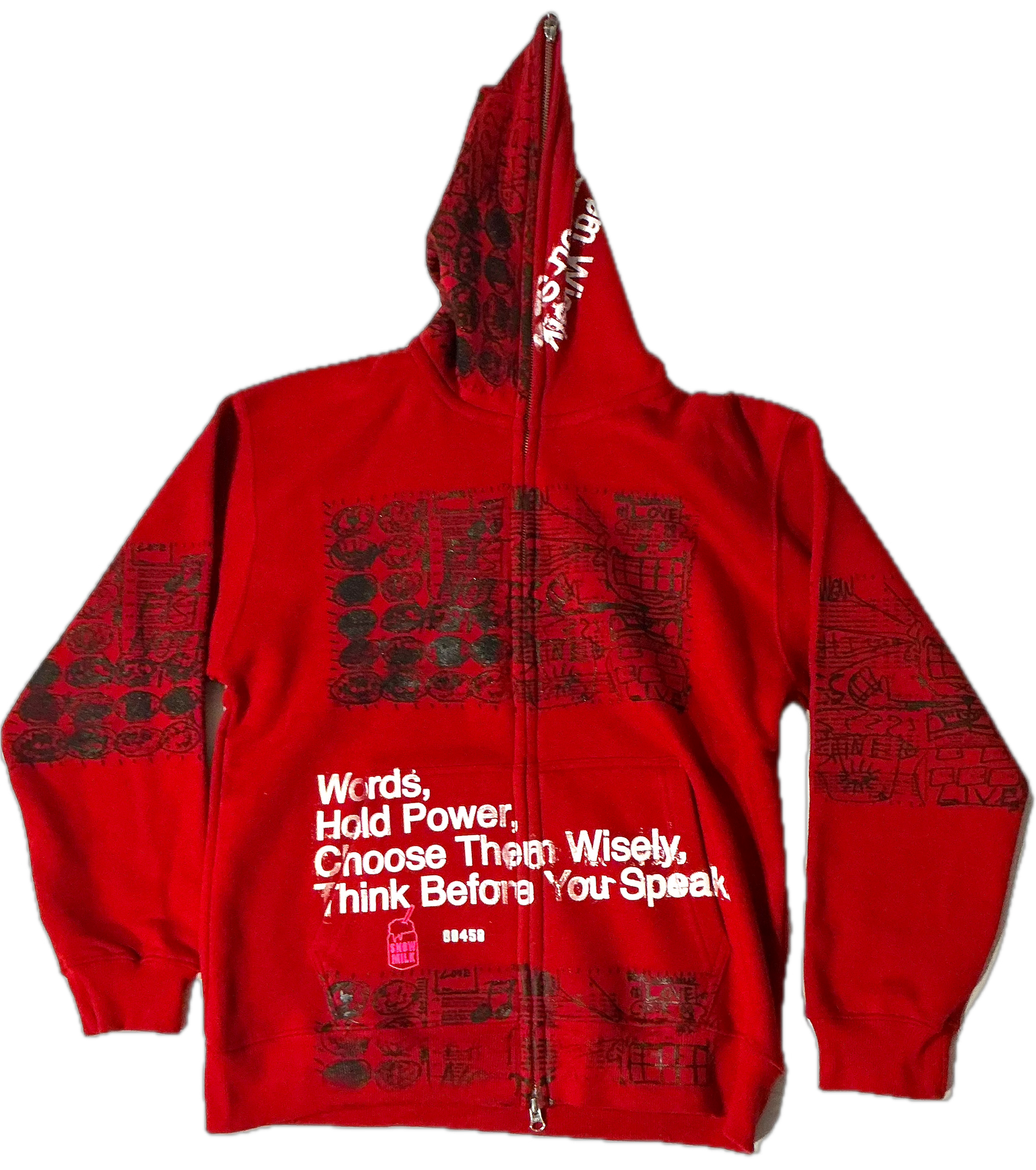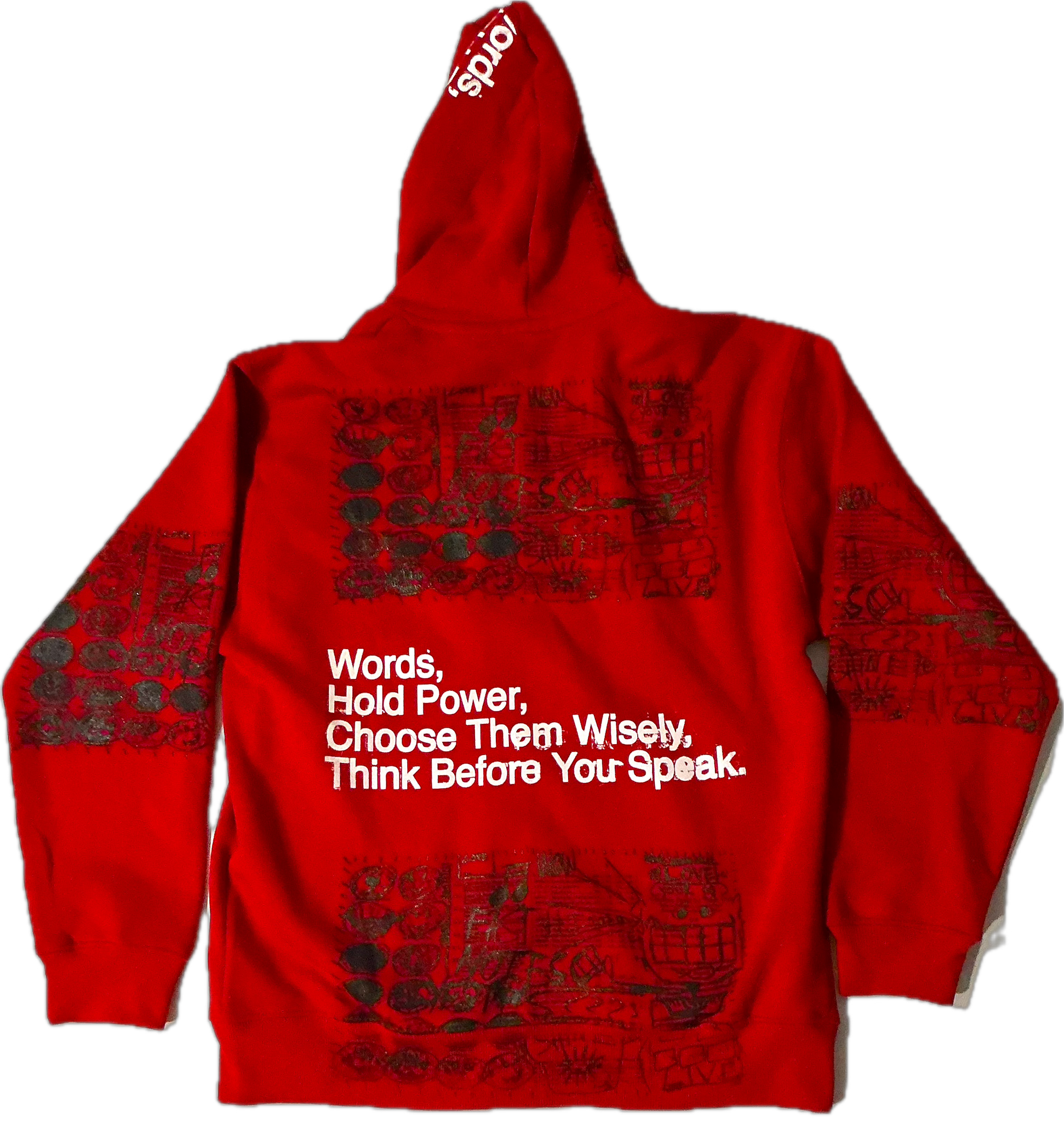 This is a one of a kind piece of clothing that has a peace sign, flowers, and Words Hold Power printed all over the garment.