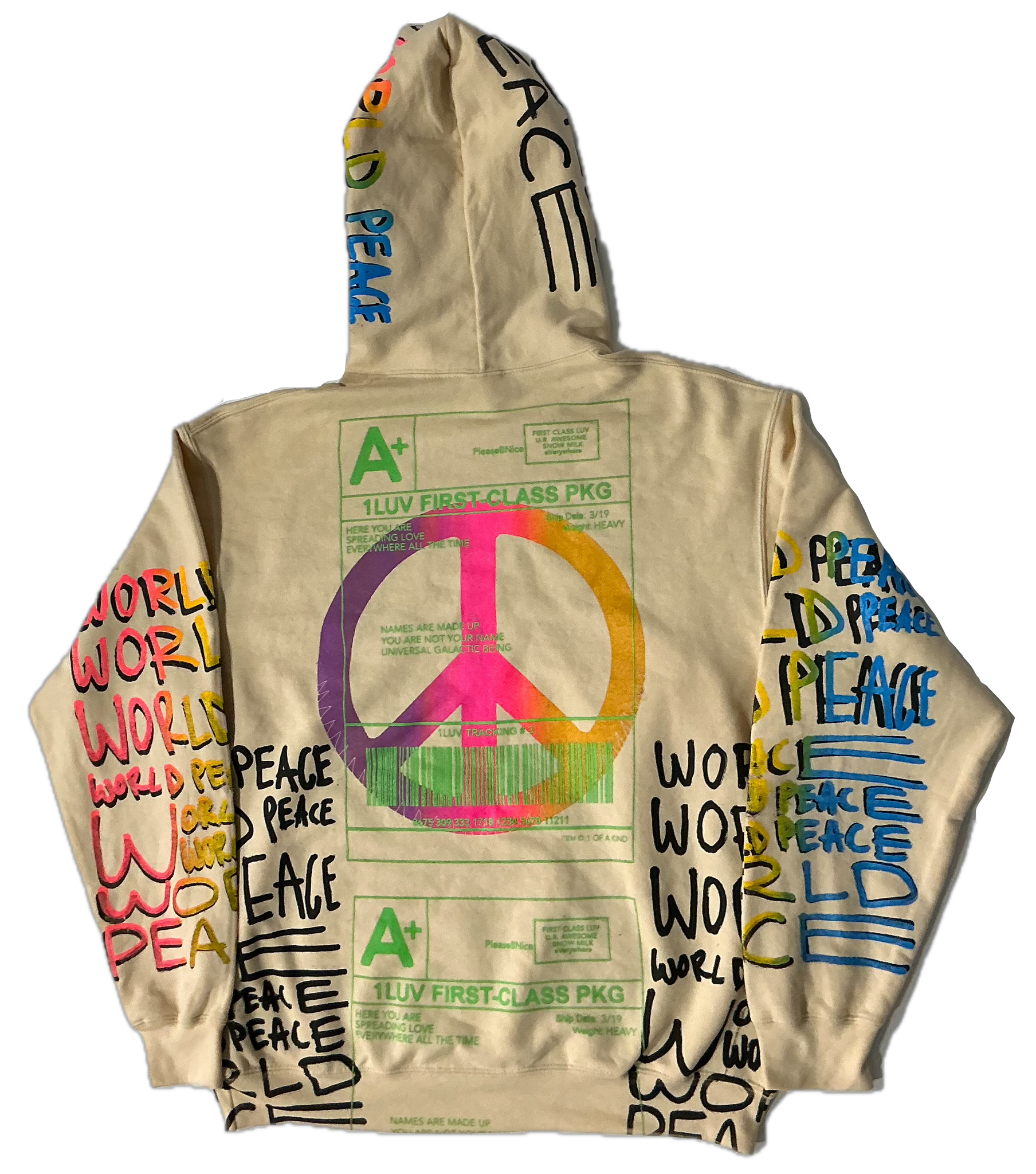 This is a one of a kind piece of clothing has peace signs, world peace and a special drawing printed all over.