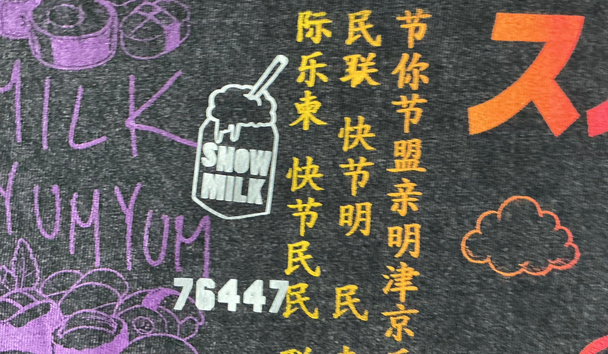 This design has a cute anime snow milk with Japanese writing and a message printed all over