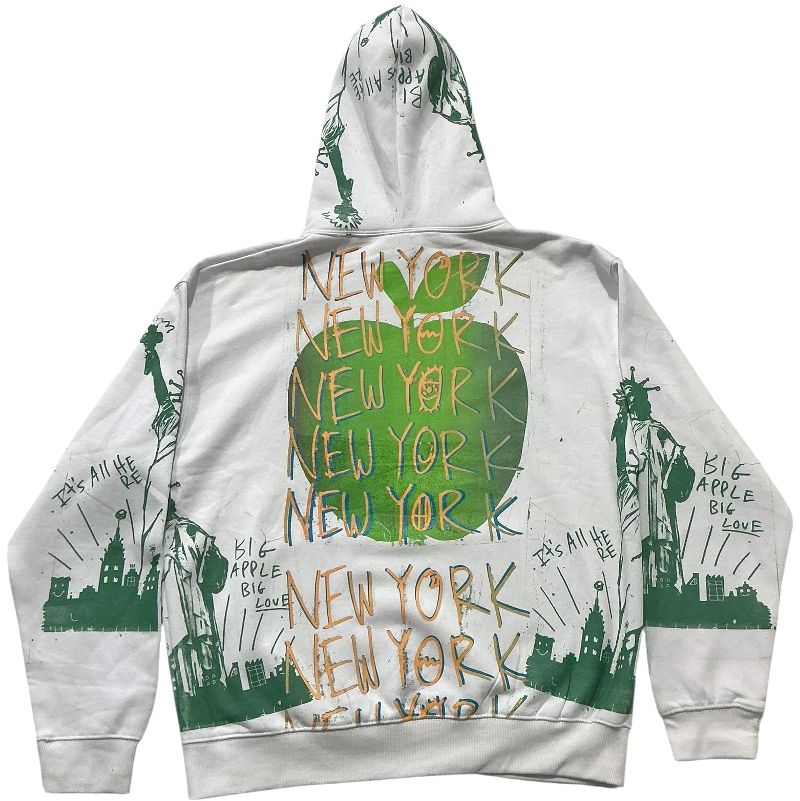 This is a one of a kind piece of clothing that has a big apple, New York, and the statue of liberty printed all over the garment.