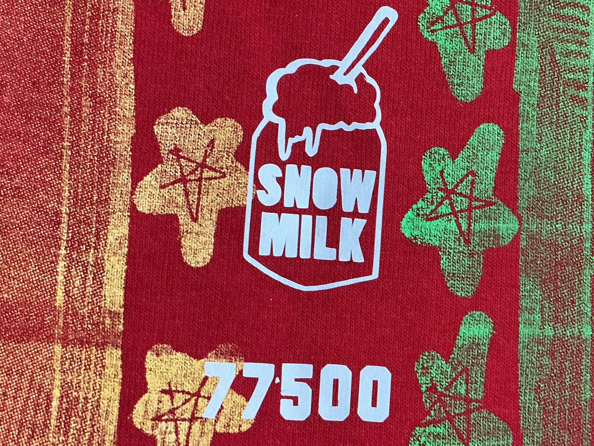 This is a one of a kind piece of clothing that has a definition of Hello & Friend with a picture of hanging sneakers printed all over the garment.