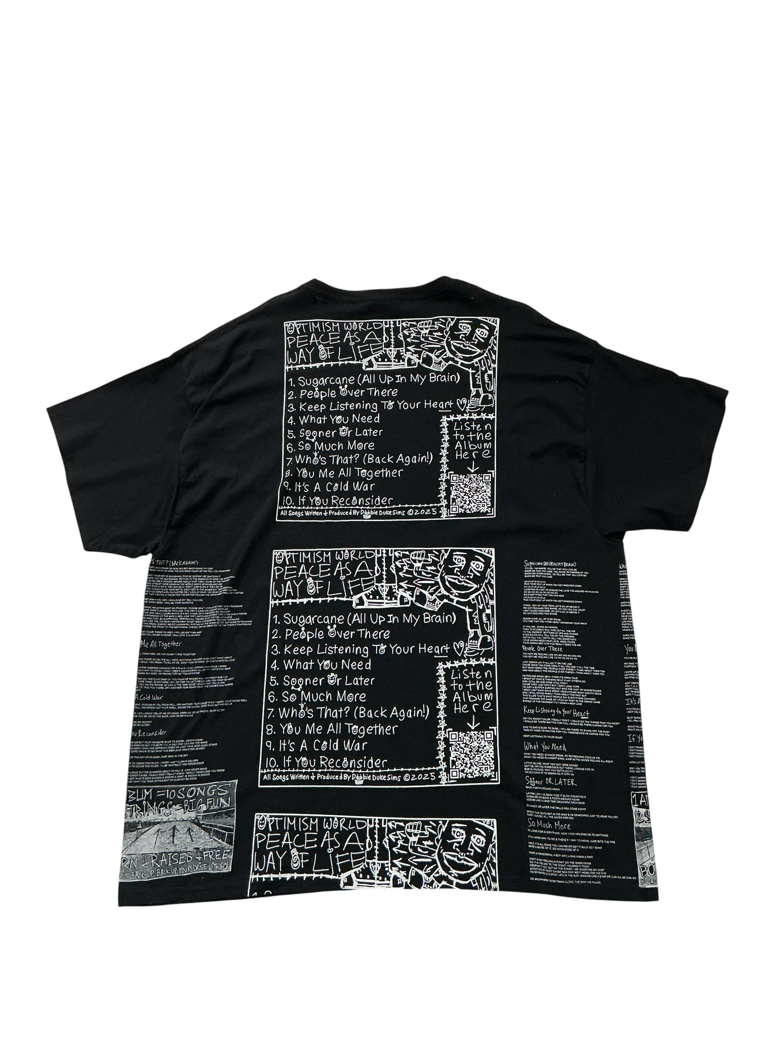 This is a one of a kind piece of clothing that is a wearable album titled "Optimism World Peace As A Way Of Life (The Wearable Album)".