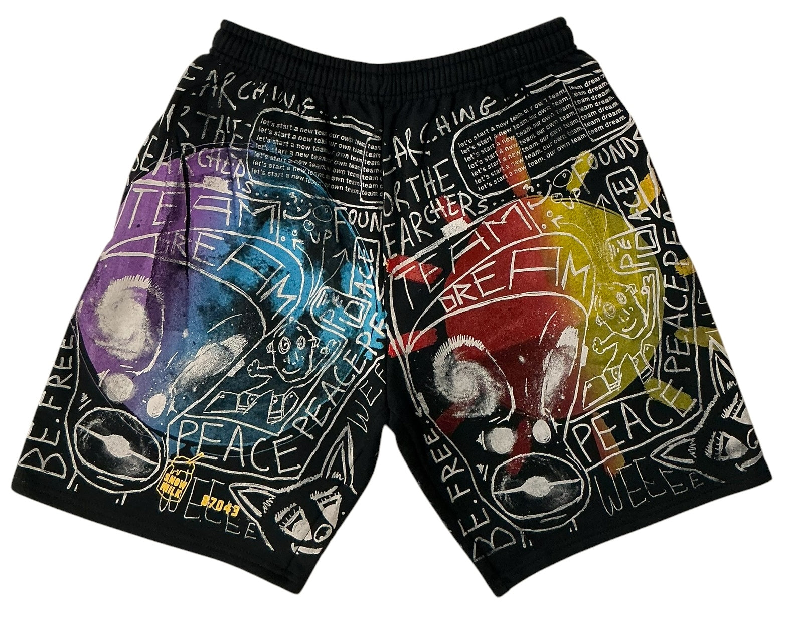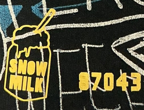 This is a one of a kind piece of clothing that has a happy character crossing the street and a special message printed on it.