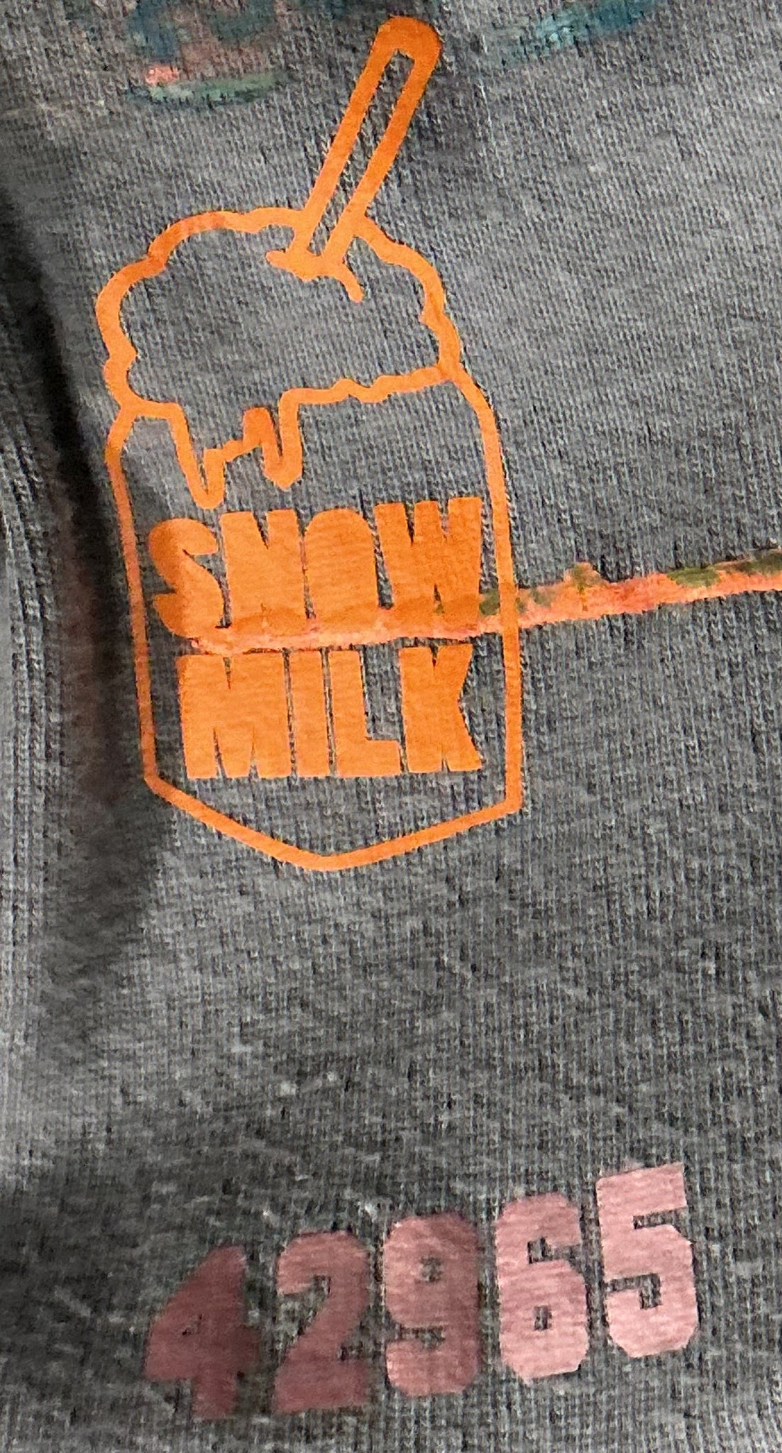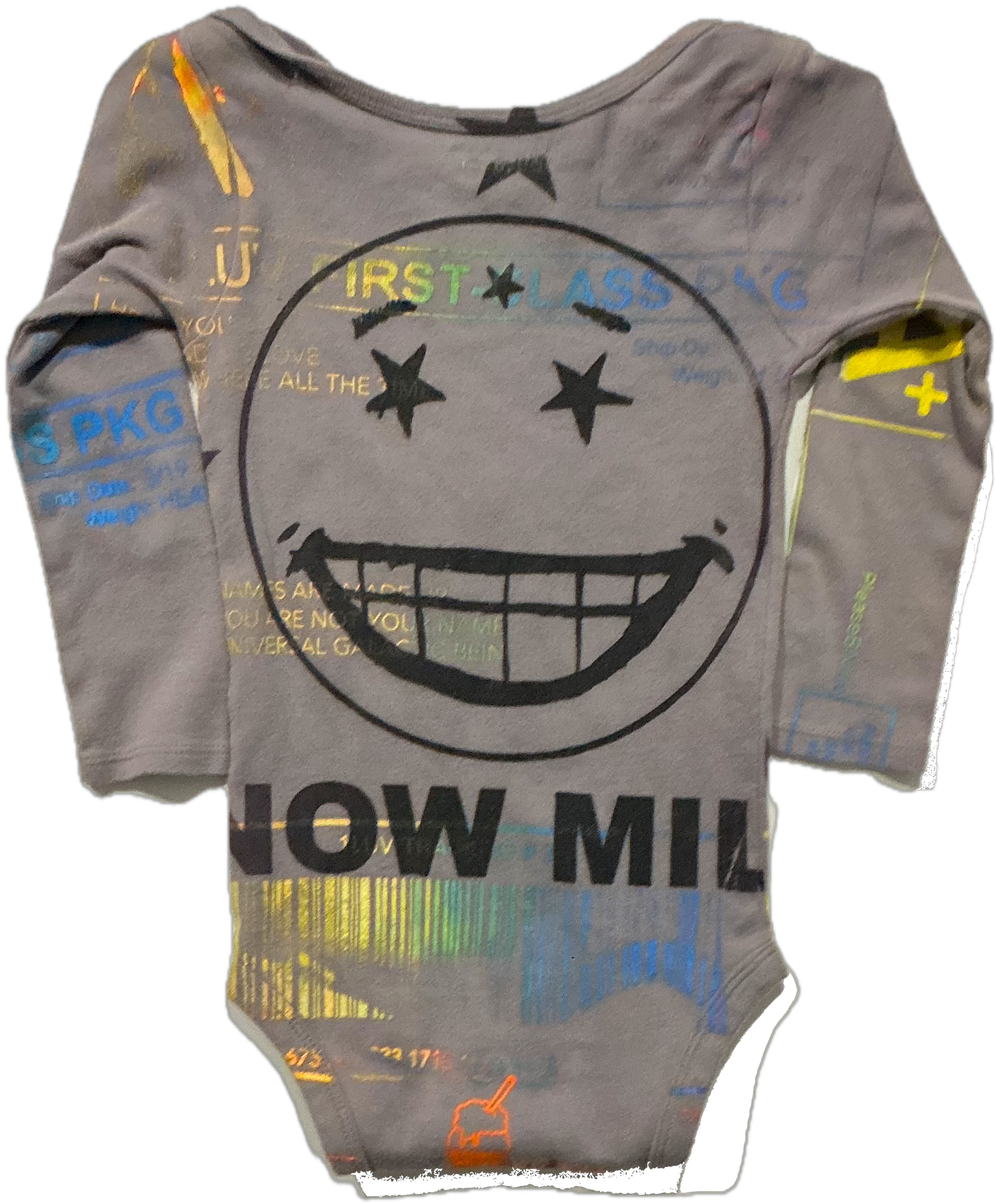This is a one of a kind piece of clothing that has an upside down doorbell character and a special message printed all over.