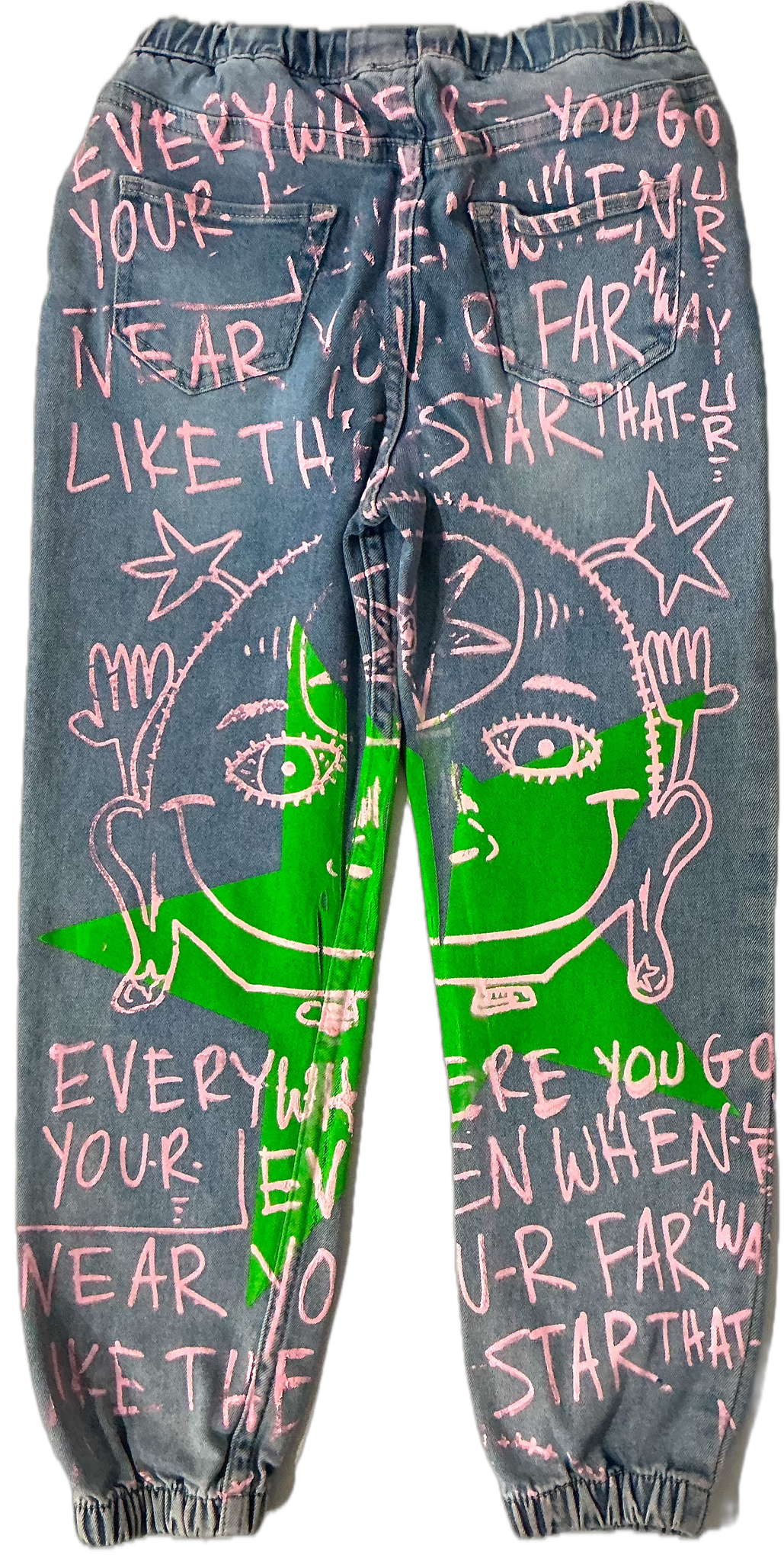 This is a one of a kind piece of clothing that has stars and a drawing of "Star That You Are" printed all over.