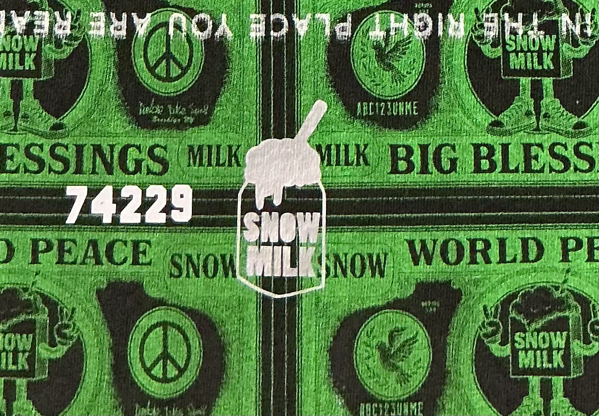 This is a one of a kind piece of clothing that has Big Blessings Bucks, Snow Milk and a special message printed all over the garment.