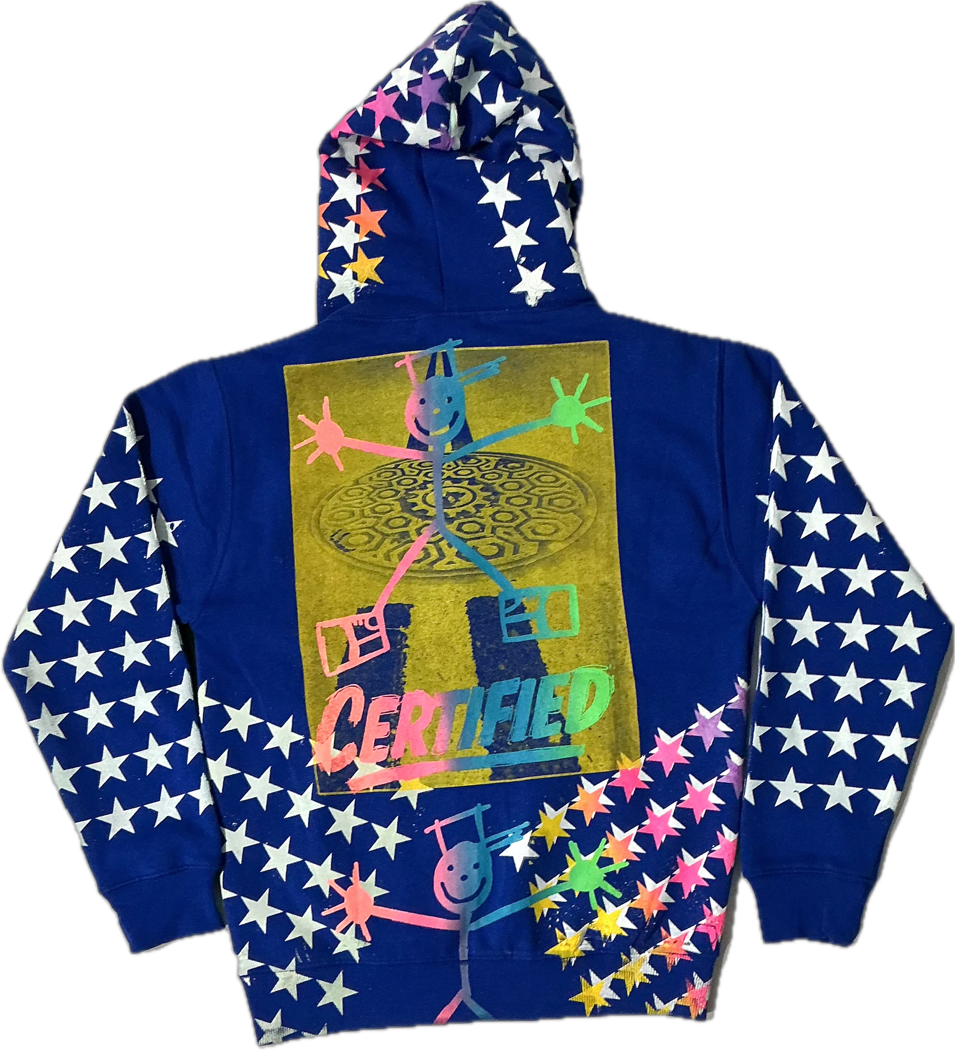 This is a one of a kind piece of clothing that has a picture of a street, stars, a stick man and Certified written all over the garment.