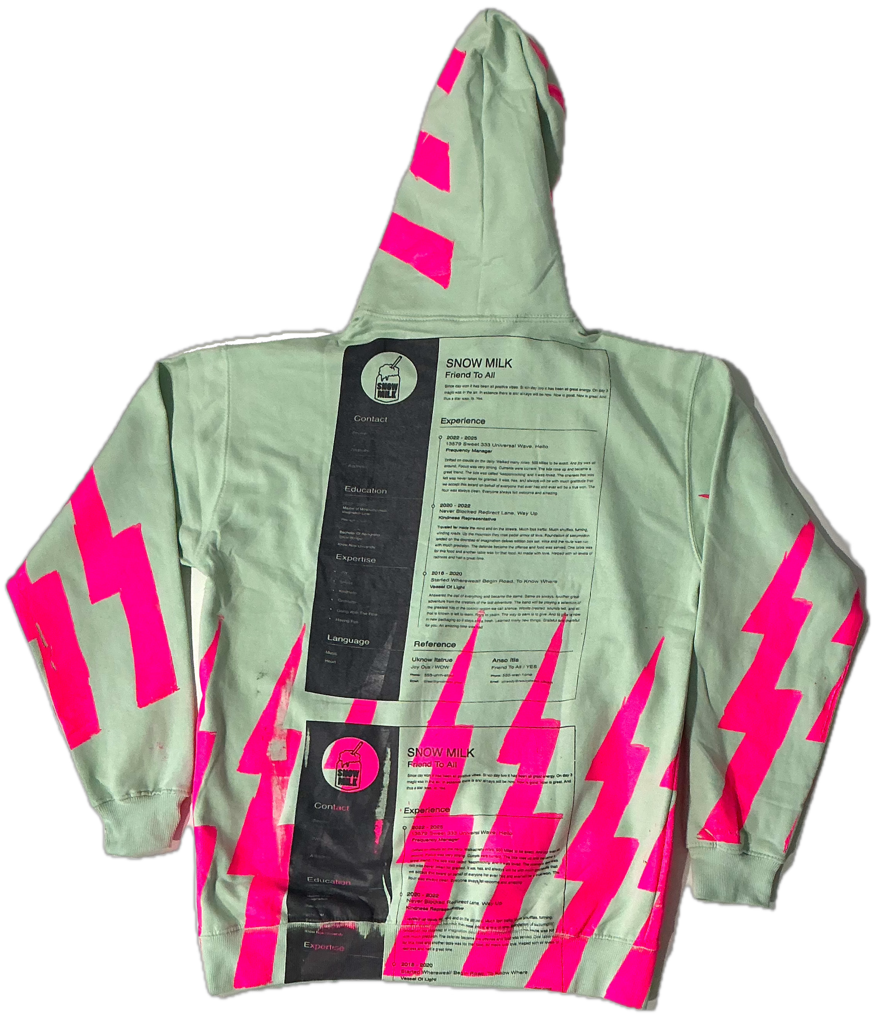 These are a one of a kind pieces of clothing that have a resume and lightning bolts printed all over the garment.
