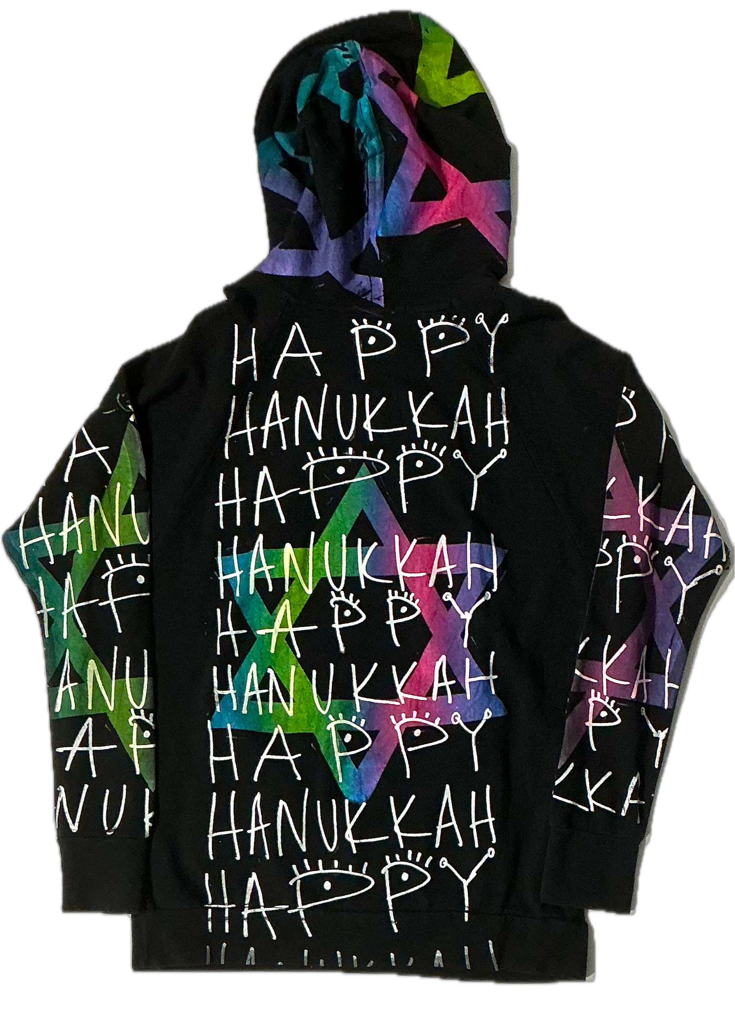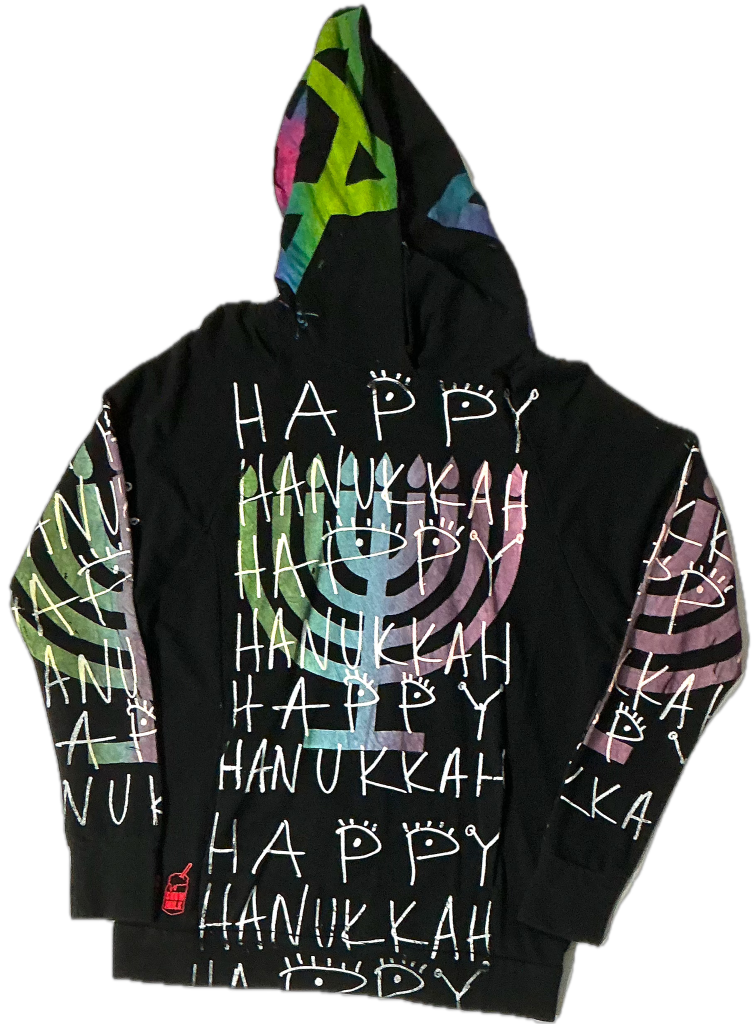 These are one of a kind pieces of thrifted and new garments that have Happy Hanukkah with a Menorah & Star Of David printed all over