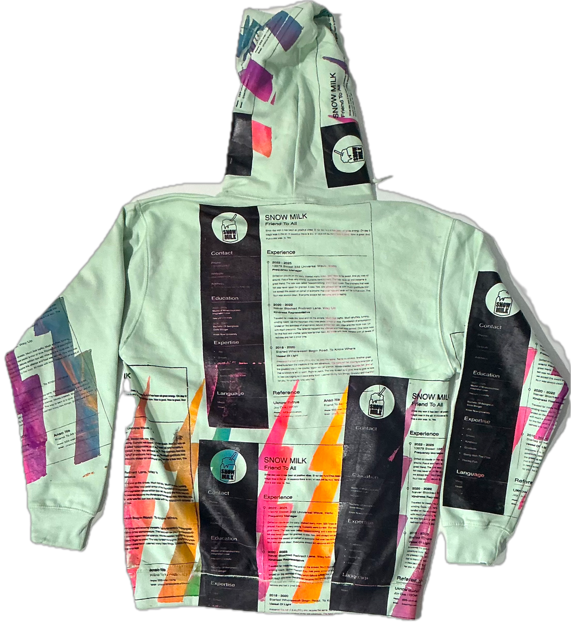 These are a one of a kind pieces of clothing that have a resume and lightning bolts printed all over the garment.