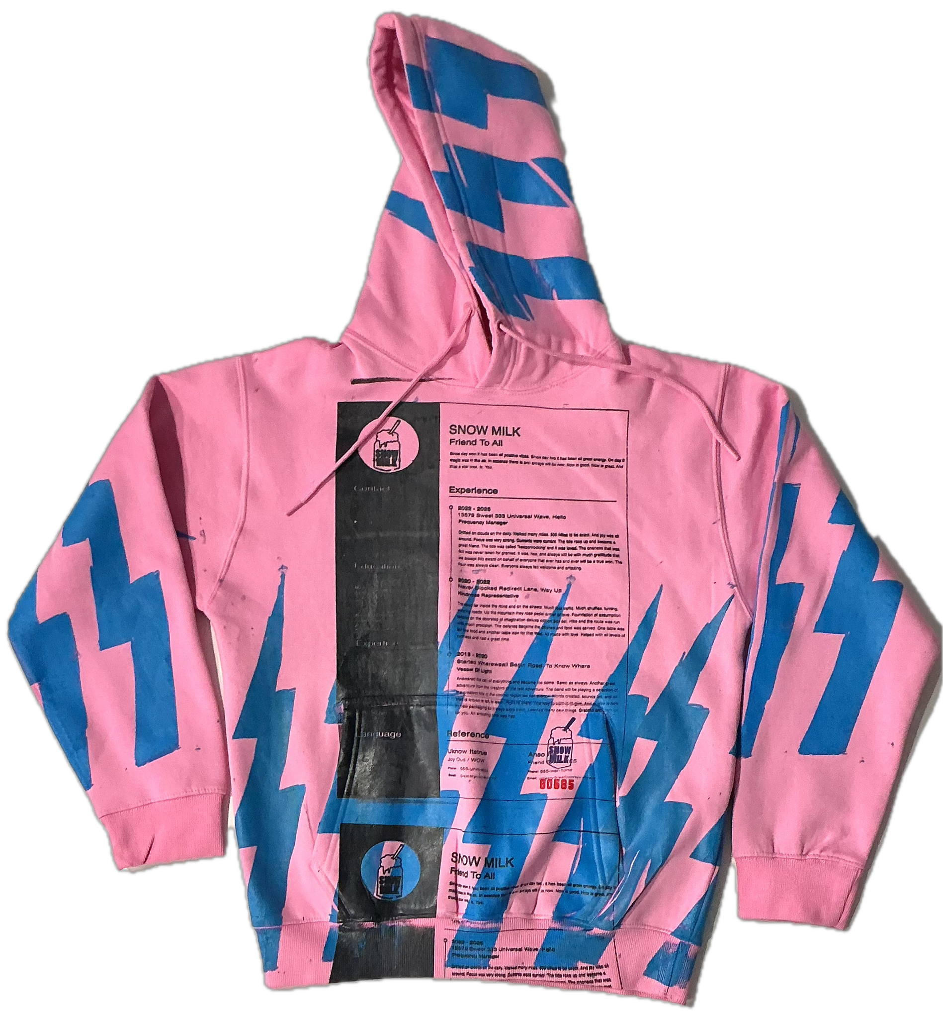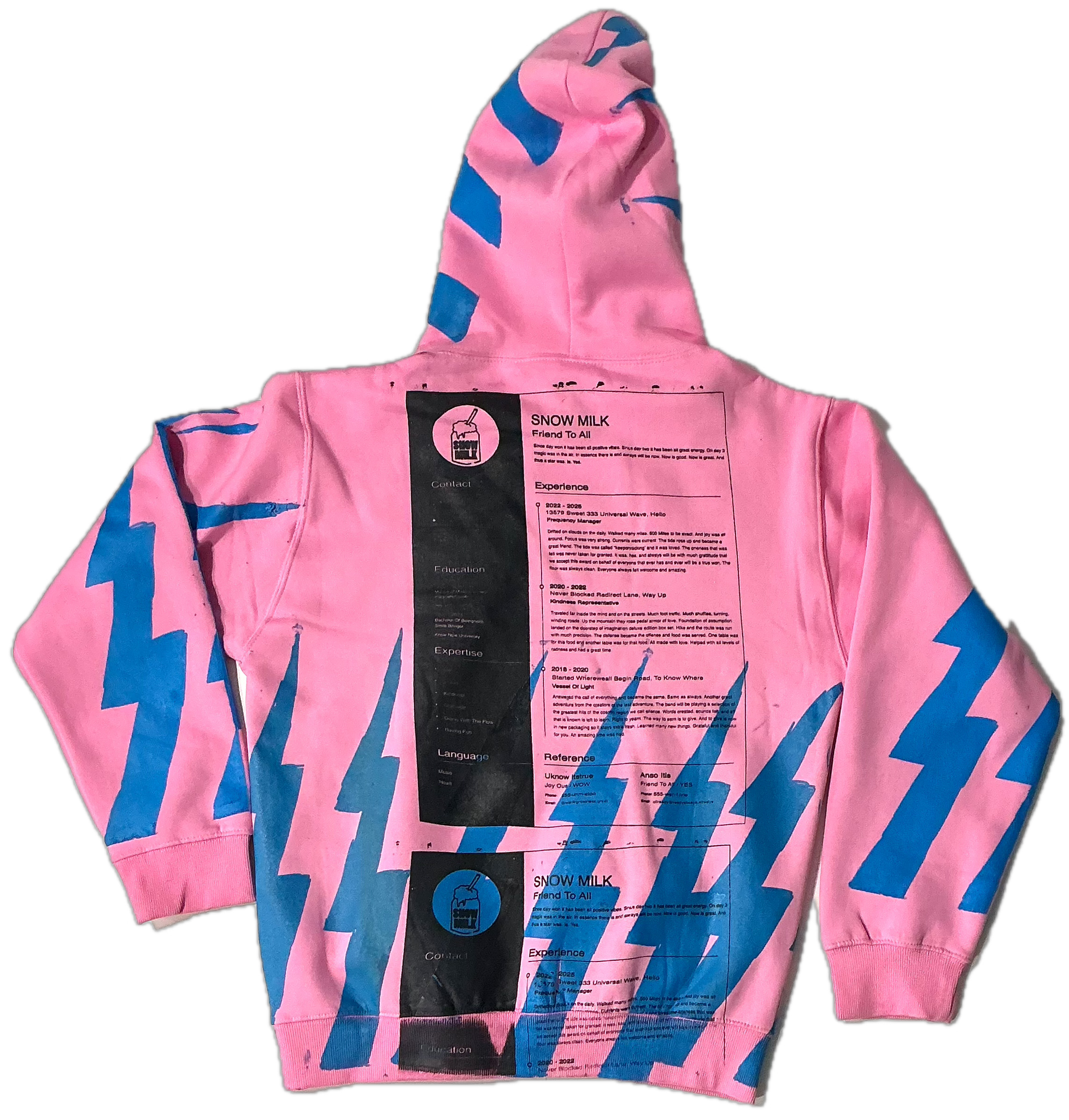 These are a one of a kind pieces of clothing that have a resume and lightning bolts printed all over the garment.