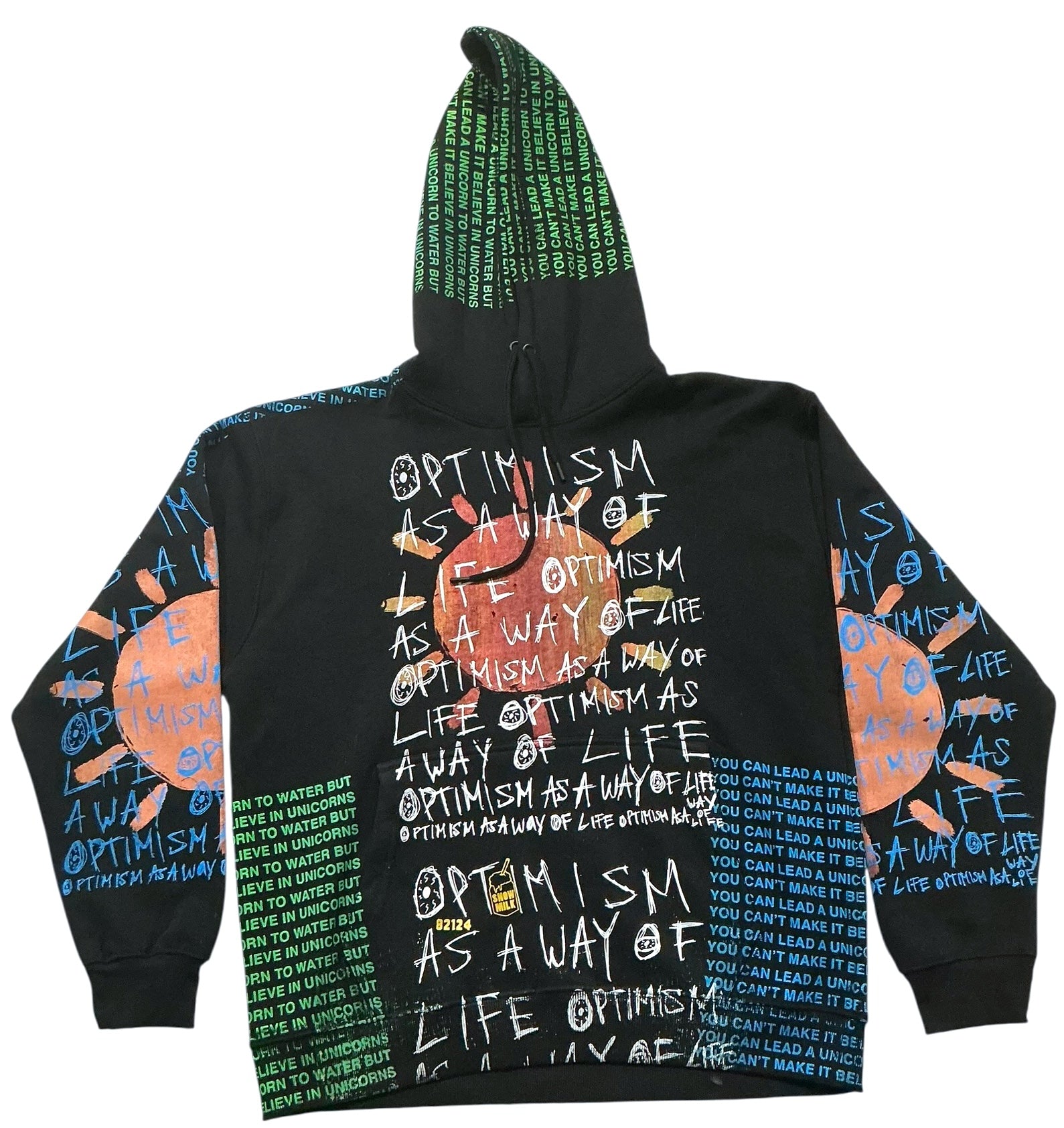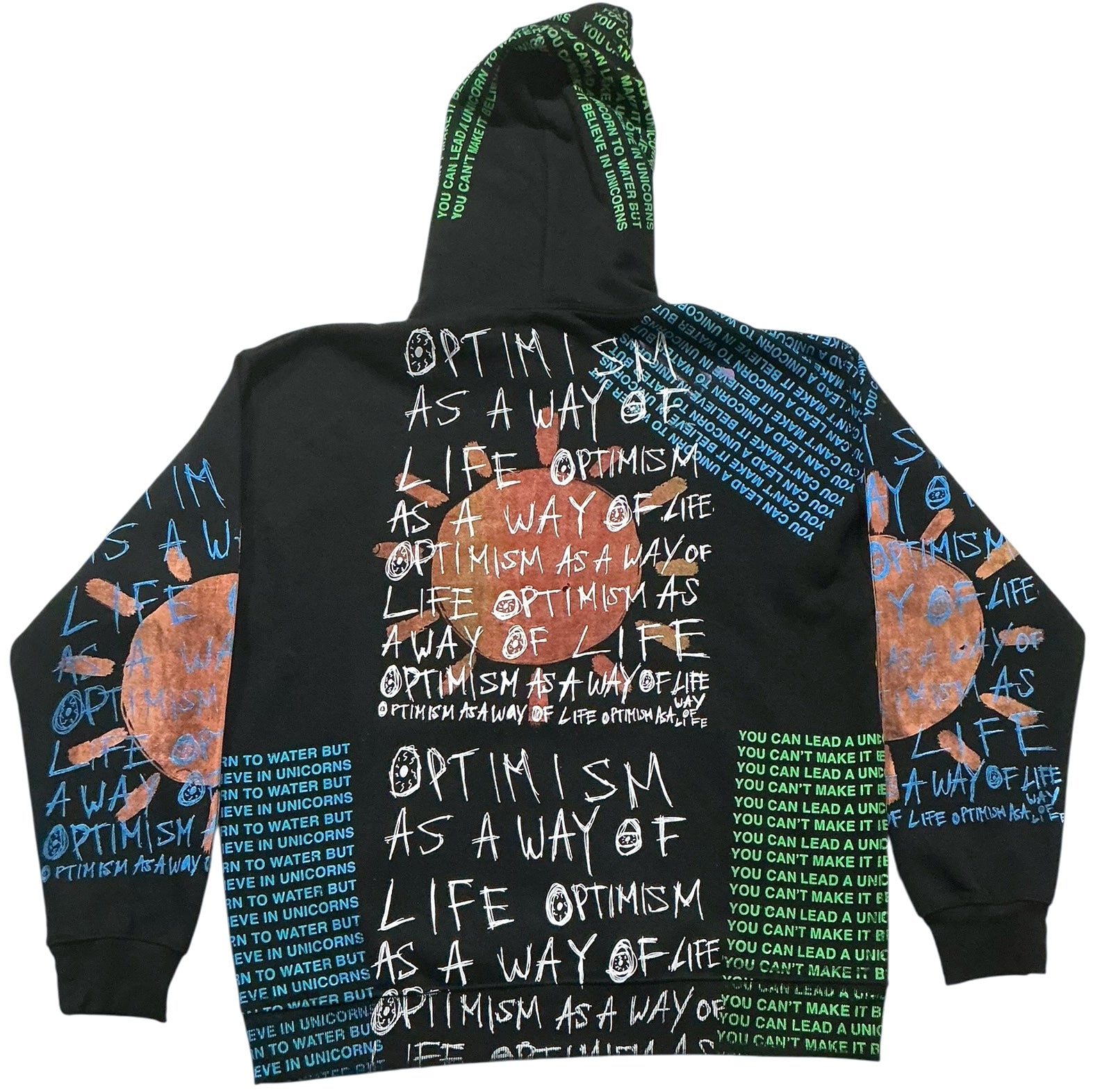 This is a one of a kind piece of clothing has a sun with optimism as a way of life printed all over.