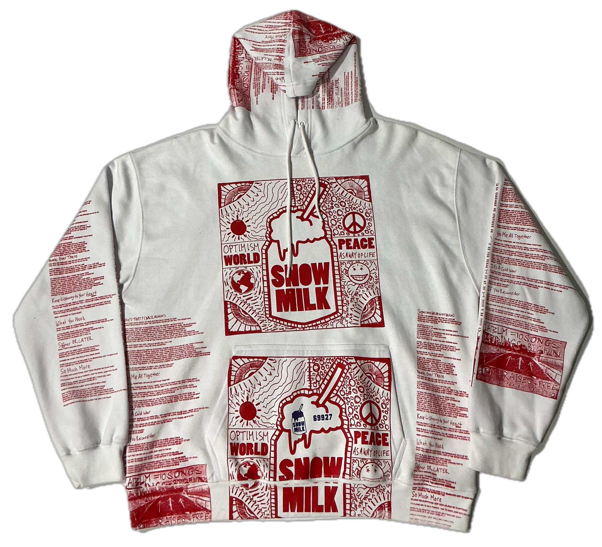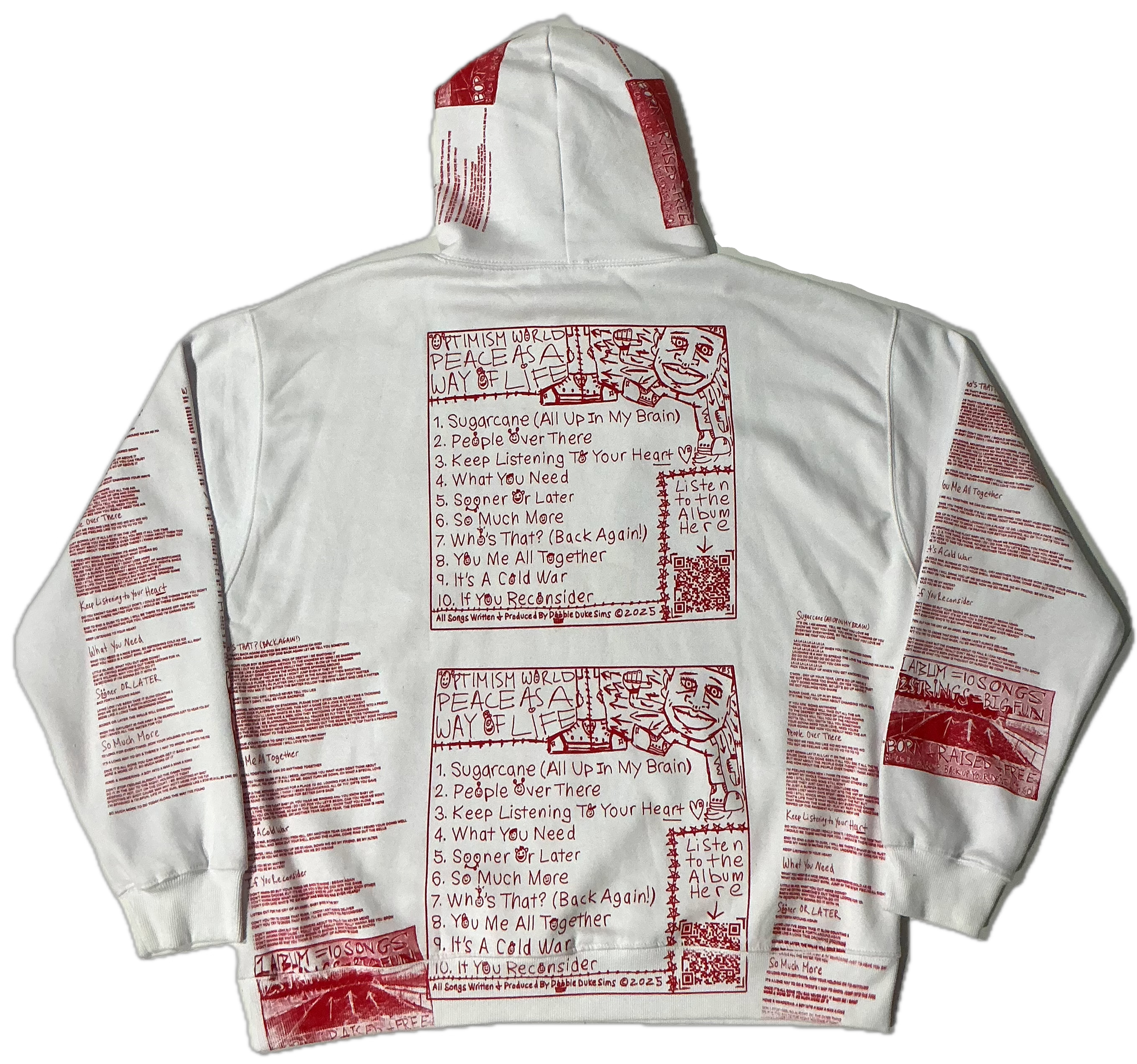 This is a one of a kind piece of clothing that is a wearable album titled "Optimism World Peace As A Way Of Life (The Wearable Album)".