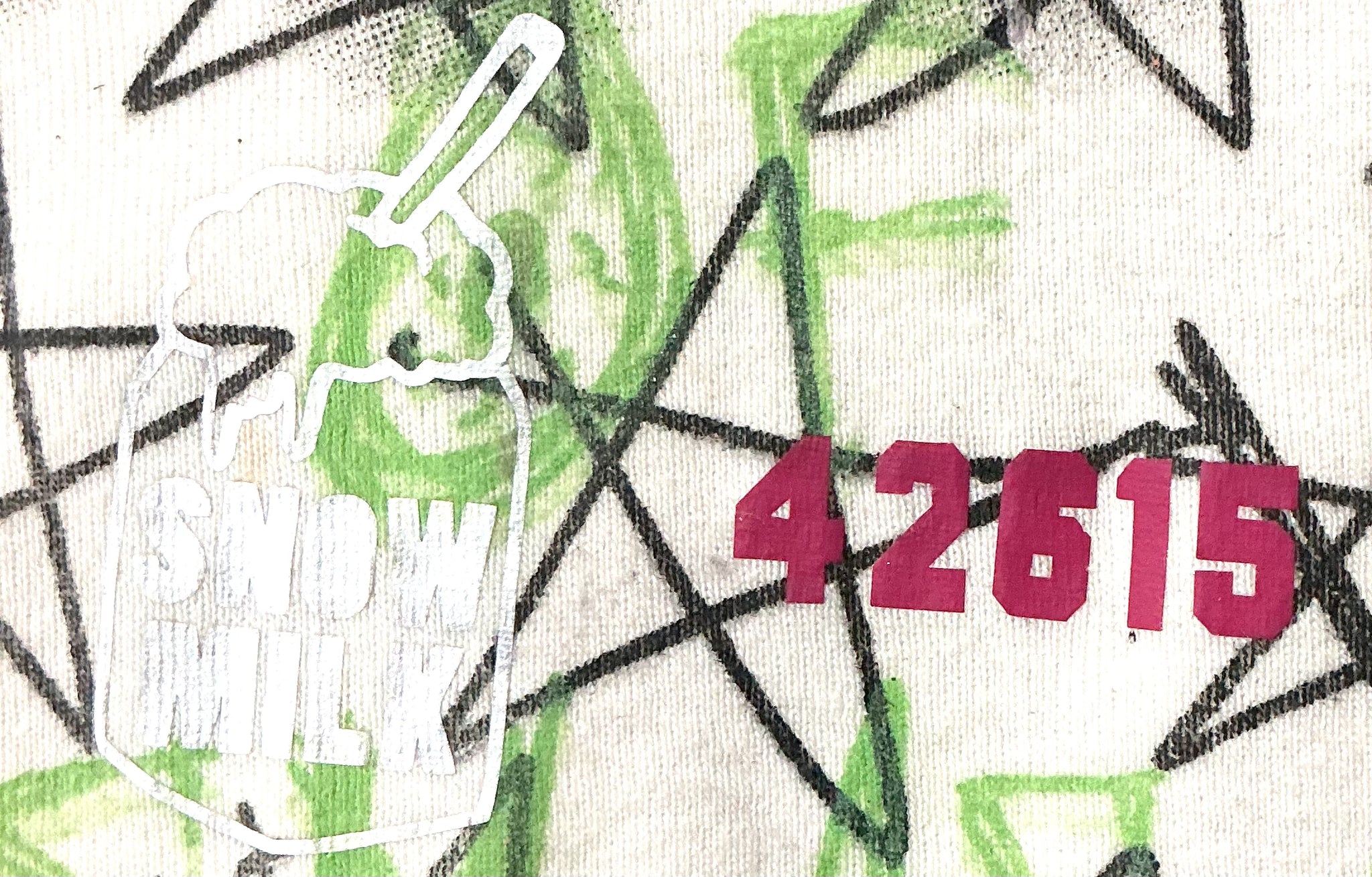 This is a one of a kind piece of clothing that has 3 characters sitting, a poem, and stars printed all over.