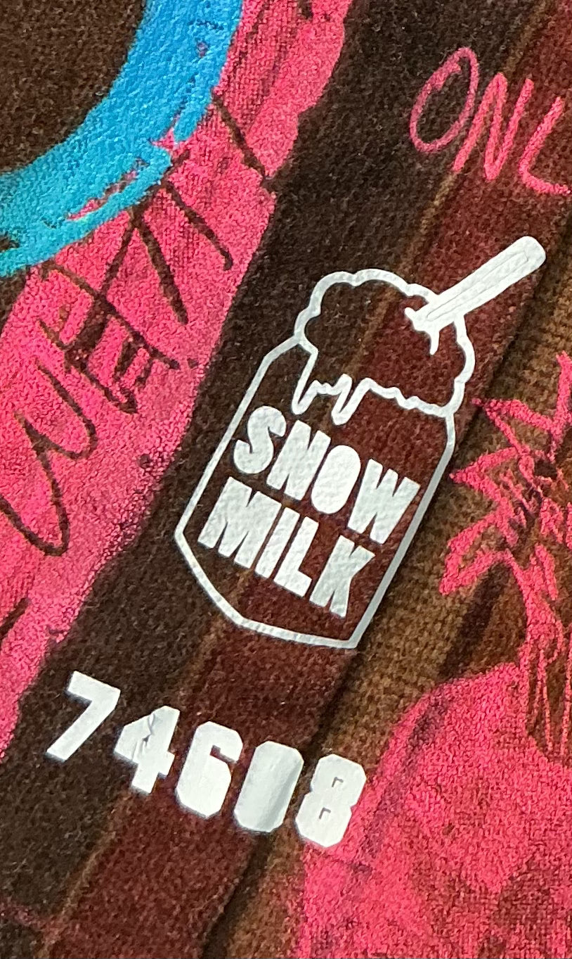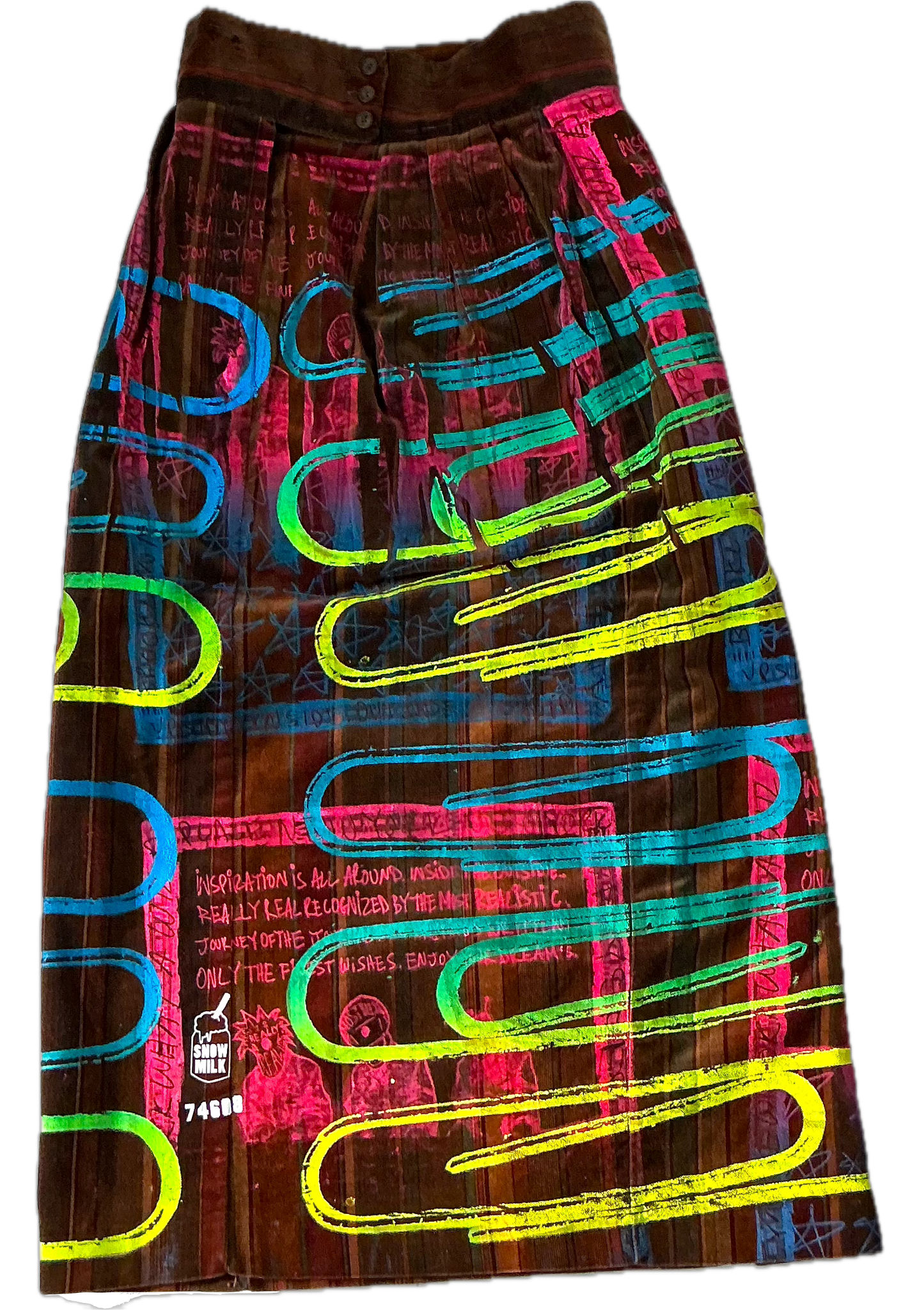 This is a one of a kind piece of clothing that has 3 characters sitting, a poem, and music notes printed all over.