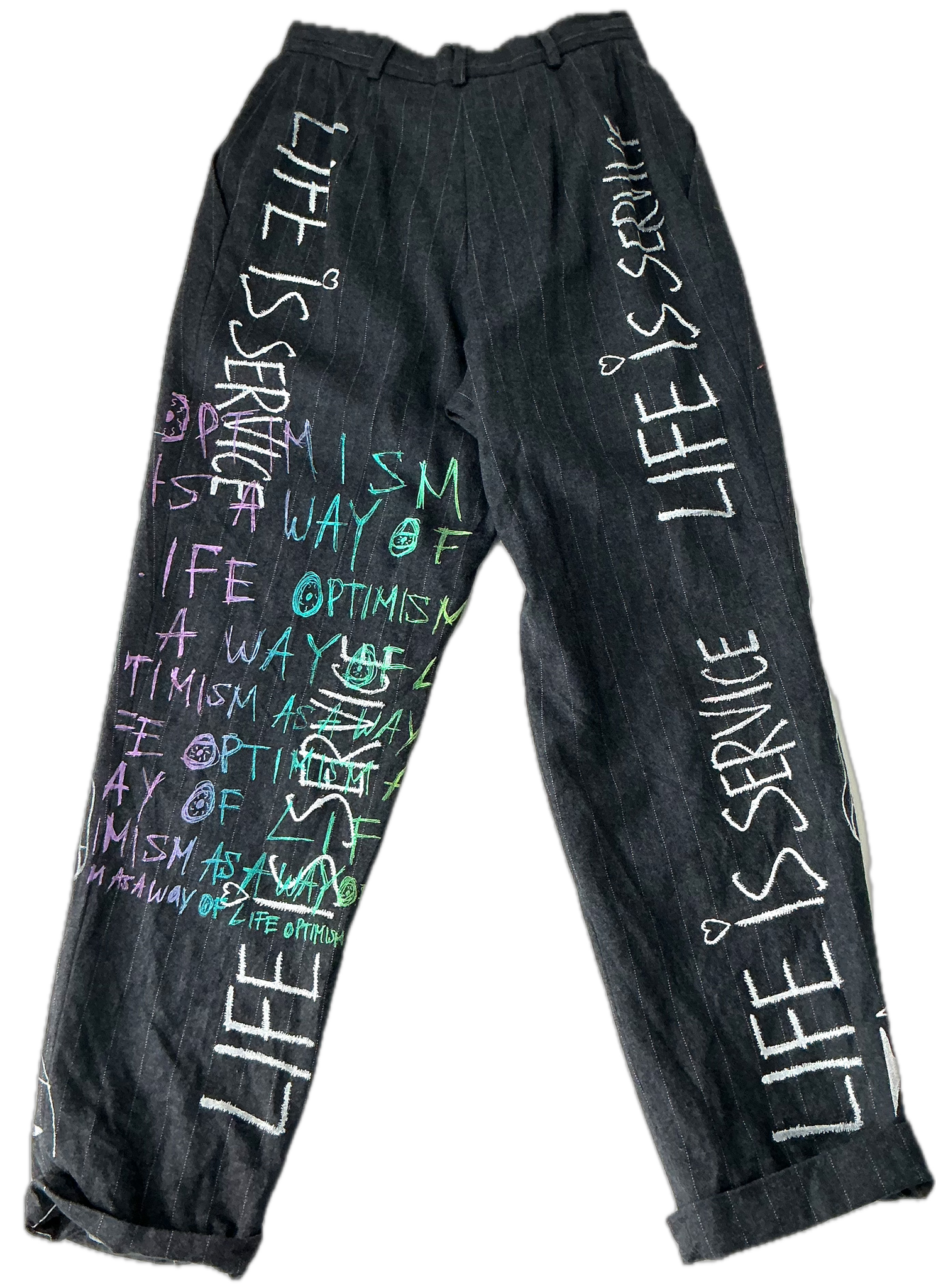 These are one of a kind pieces of clothing that were hand picked from the thrift store and then printed on. They have a vintage awesome feel and have kid like drawings printed all over.