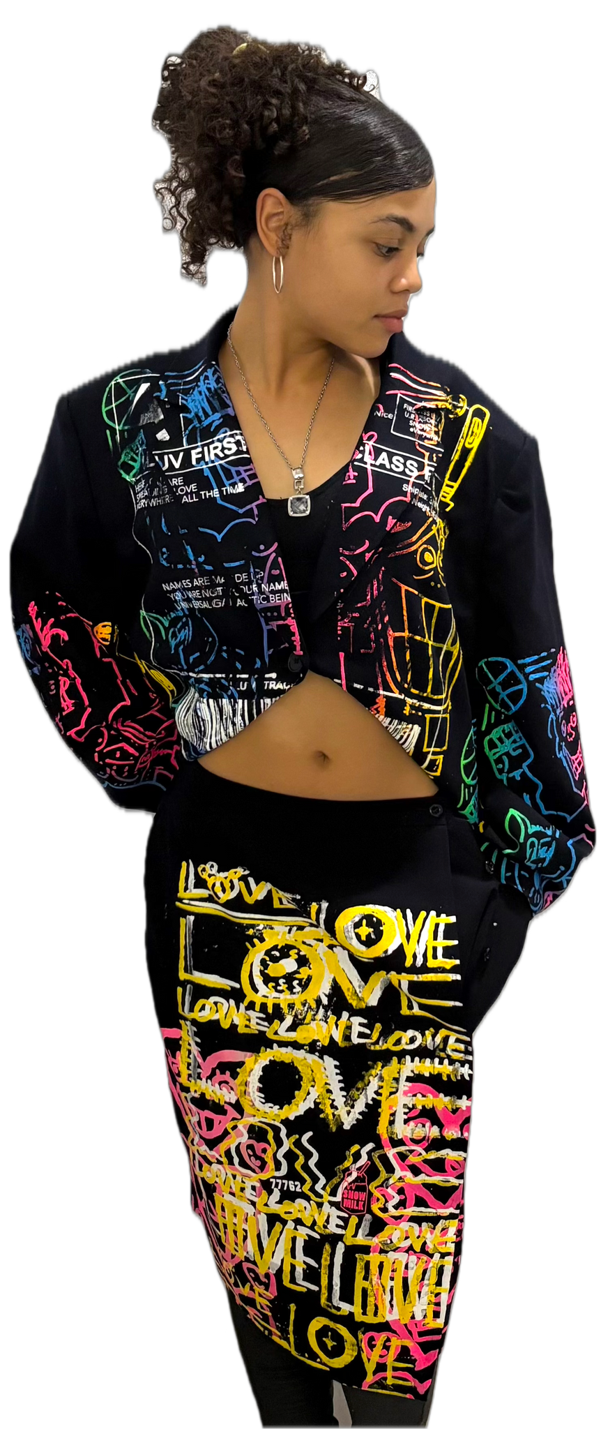 This is a one of a kind piece of clothing that has Music notes & Love printed all over.