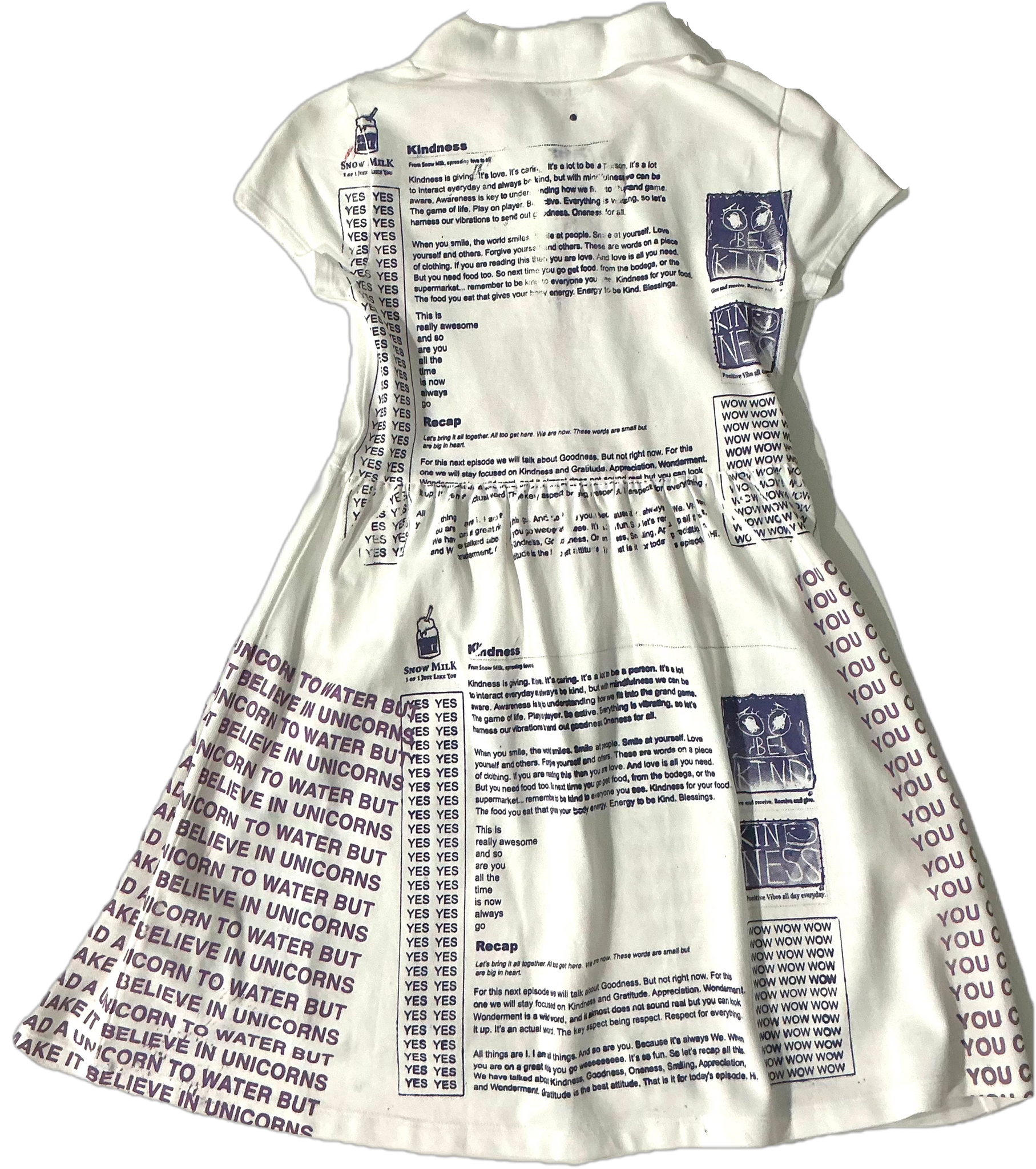 This is a one of a kind piece of clothing that has the page of kindness with the snow milk 3 star smile printed all over.