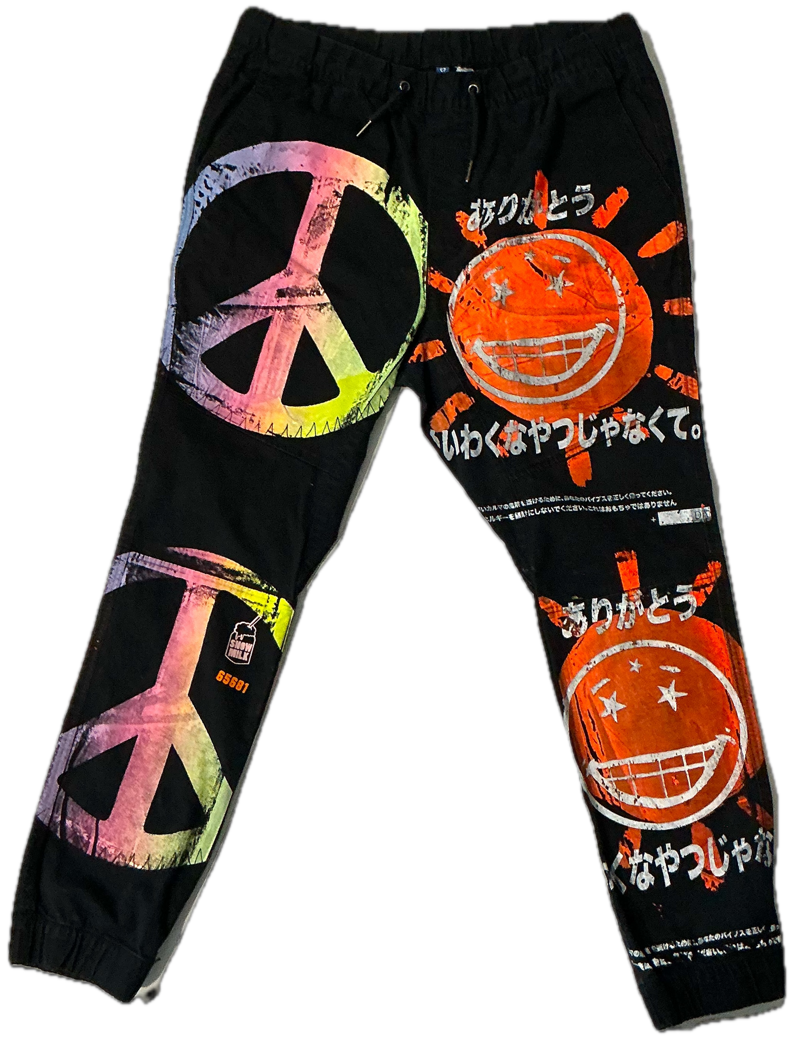 This is a one of a kind piece of clothing has peace signs, world peace and a special drawing printed all over.
