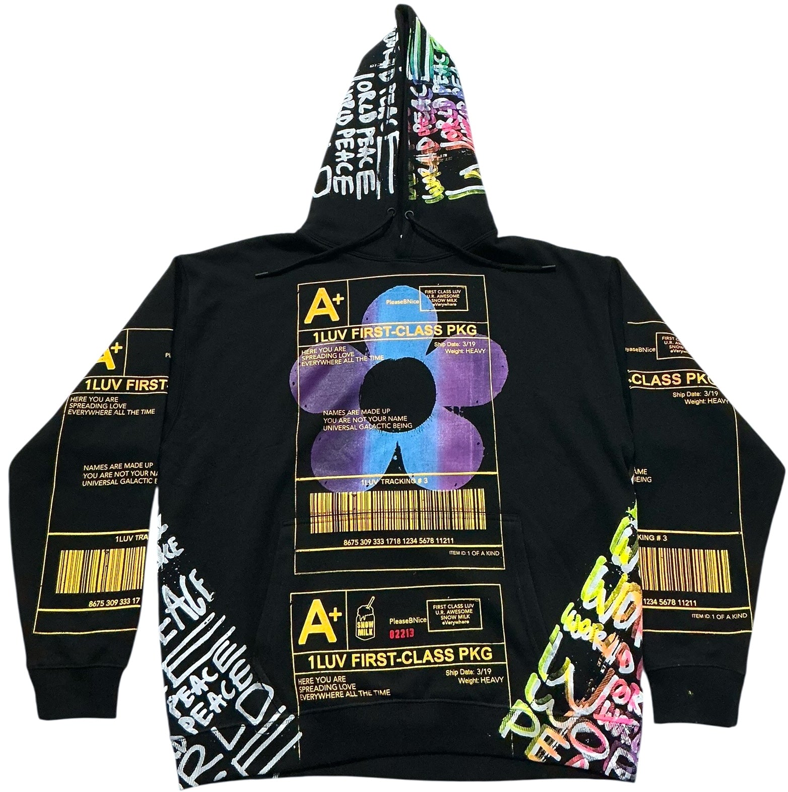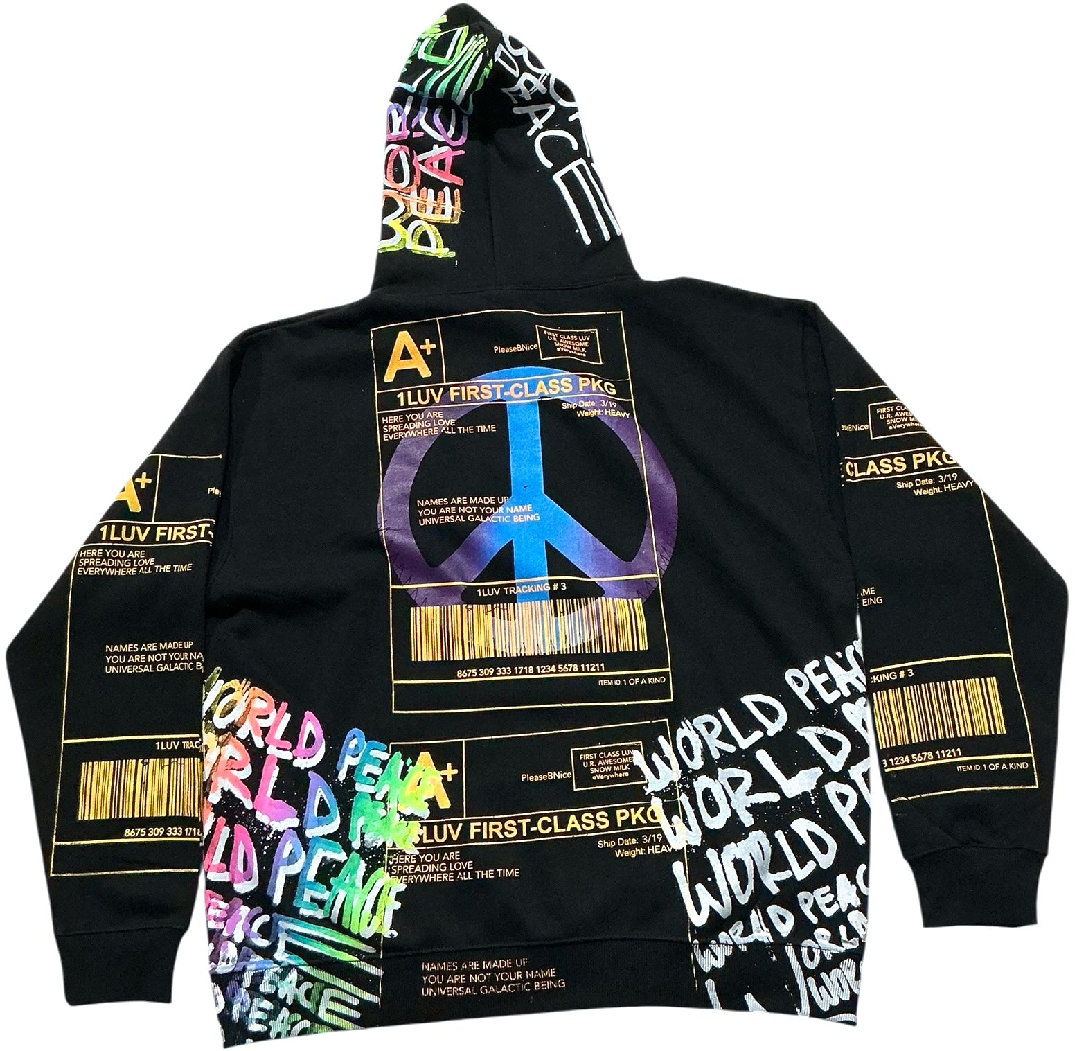 This is a one of a kind piece of clothing printed with the positive shipping label all over.