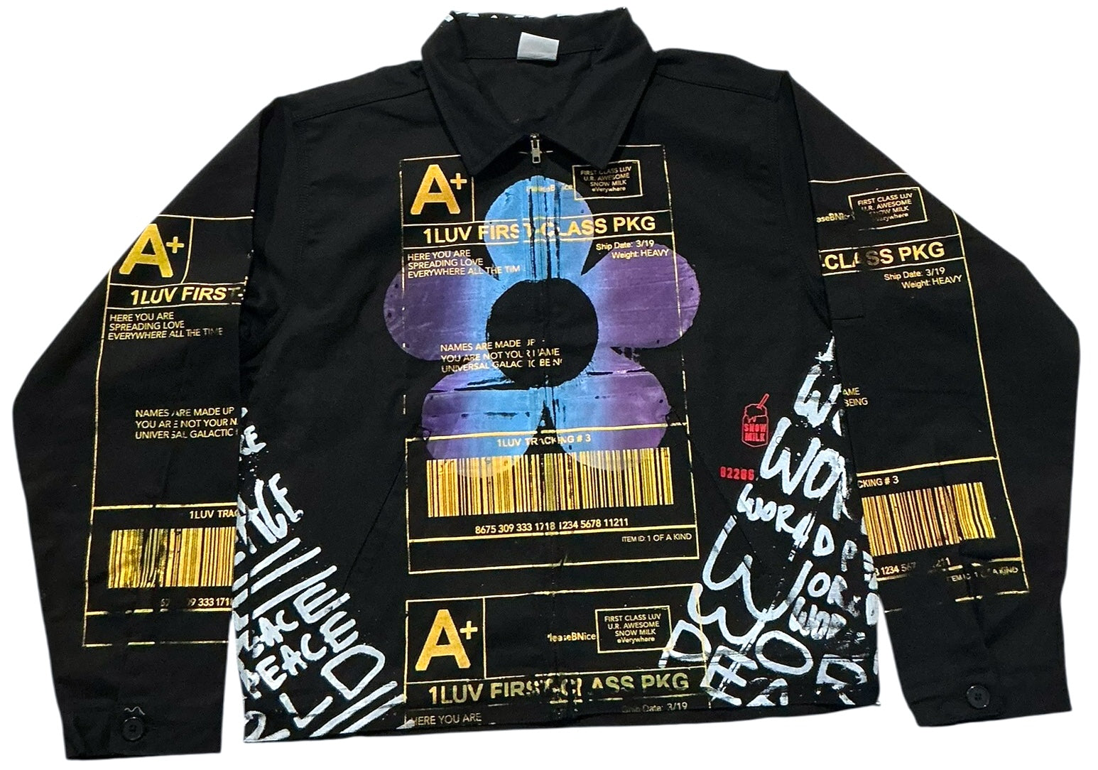 This is a one of a kind piece of clothing printed with the positive shipping label all over.