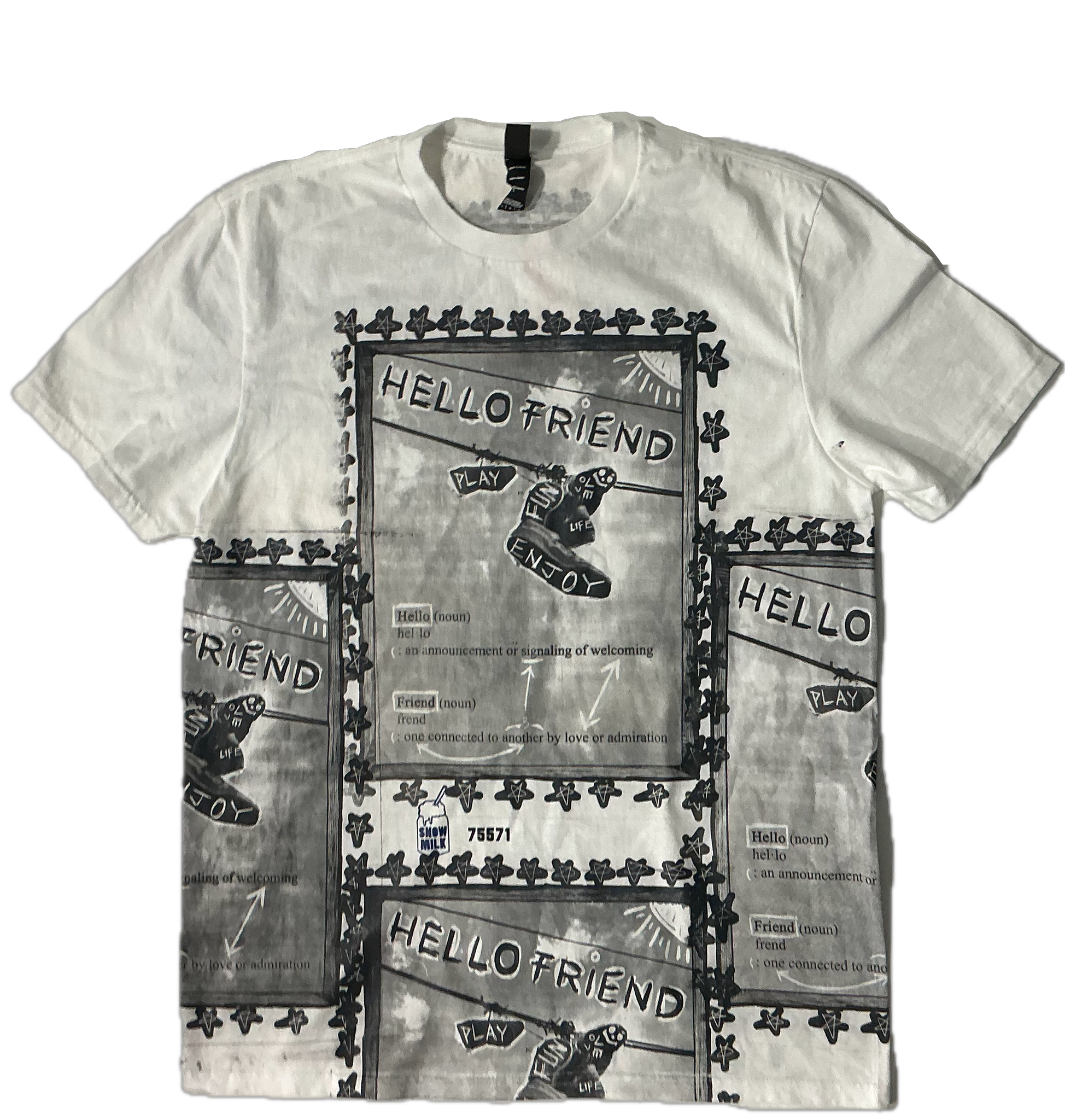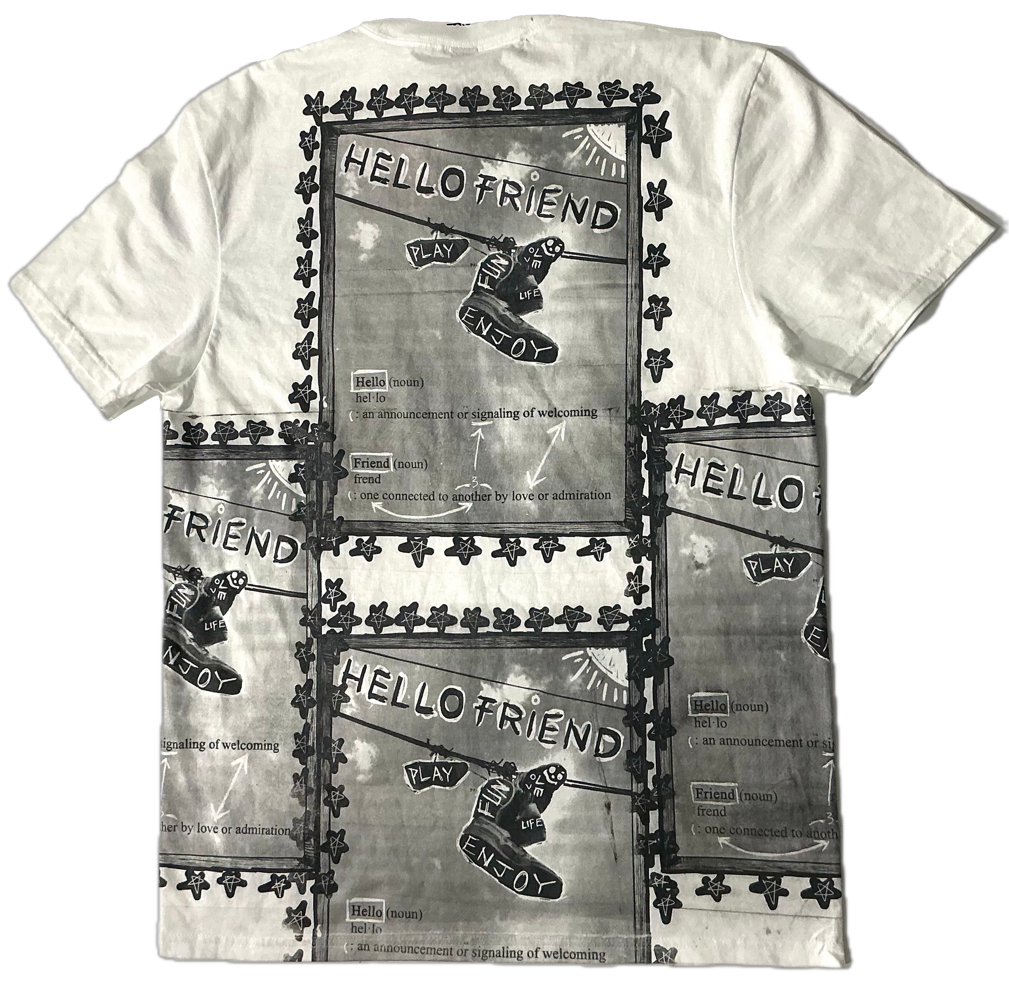 This is a one of a kind piece of clothing that has a definition of Hello & Friend with a picture of hanging sneakers printed all over the garment.