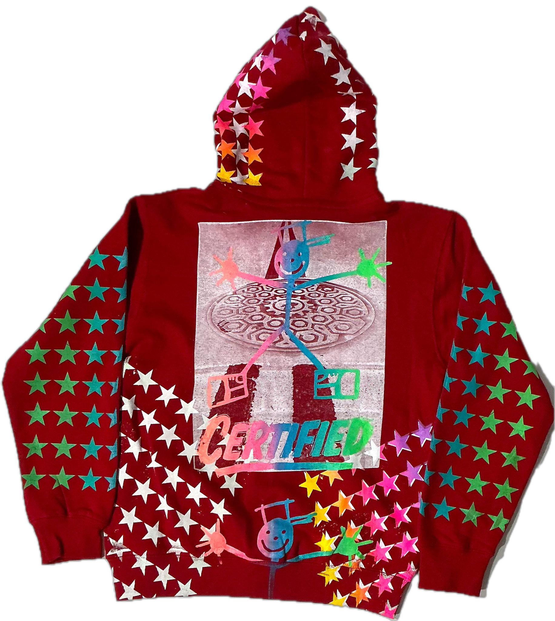 This is a one of a kind piece of clothing that has a picture of a street, stars, a stick man and Certified written all over the garment.