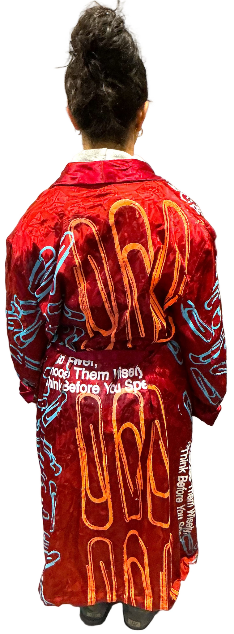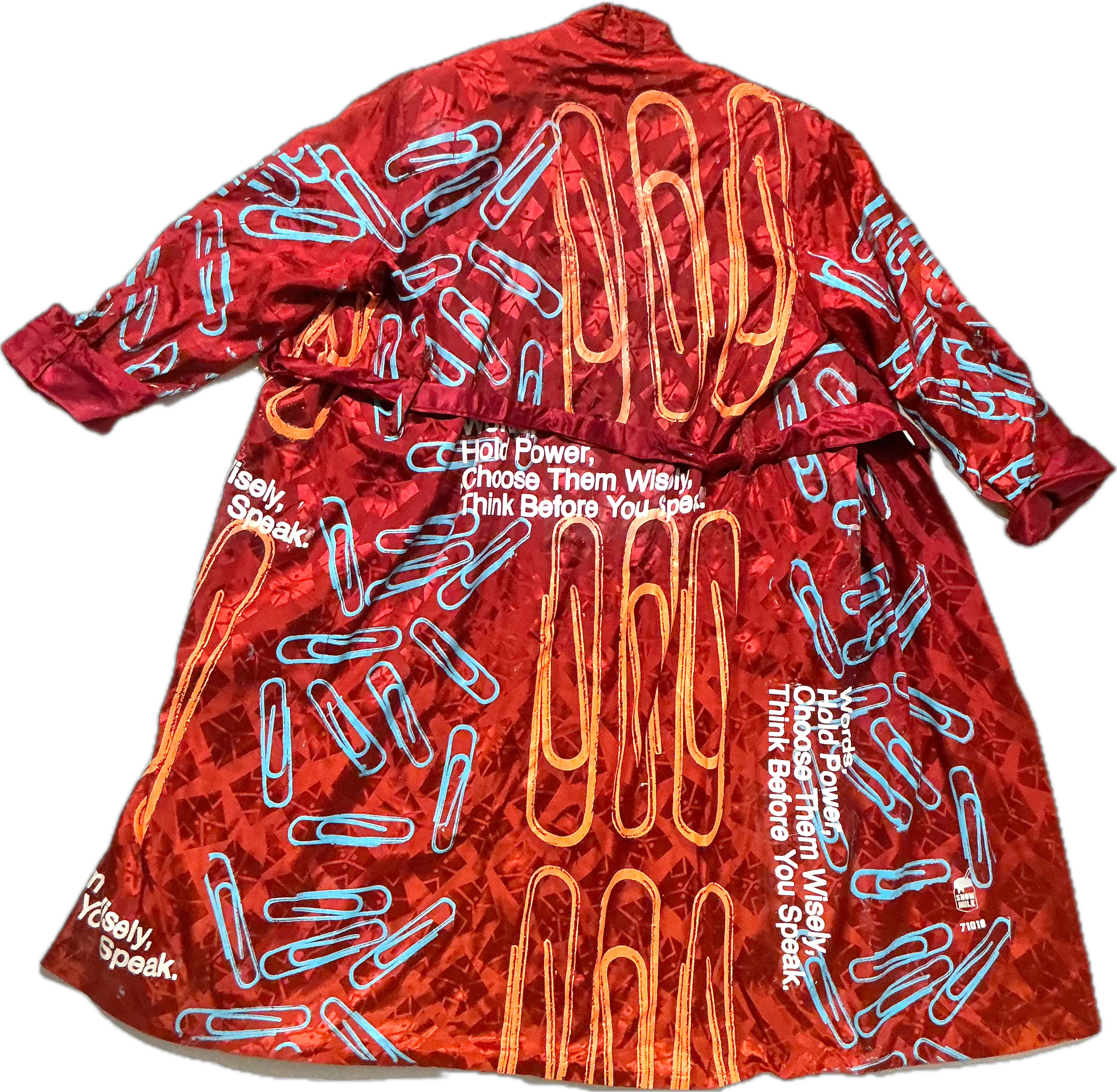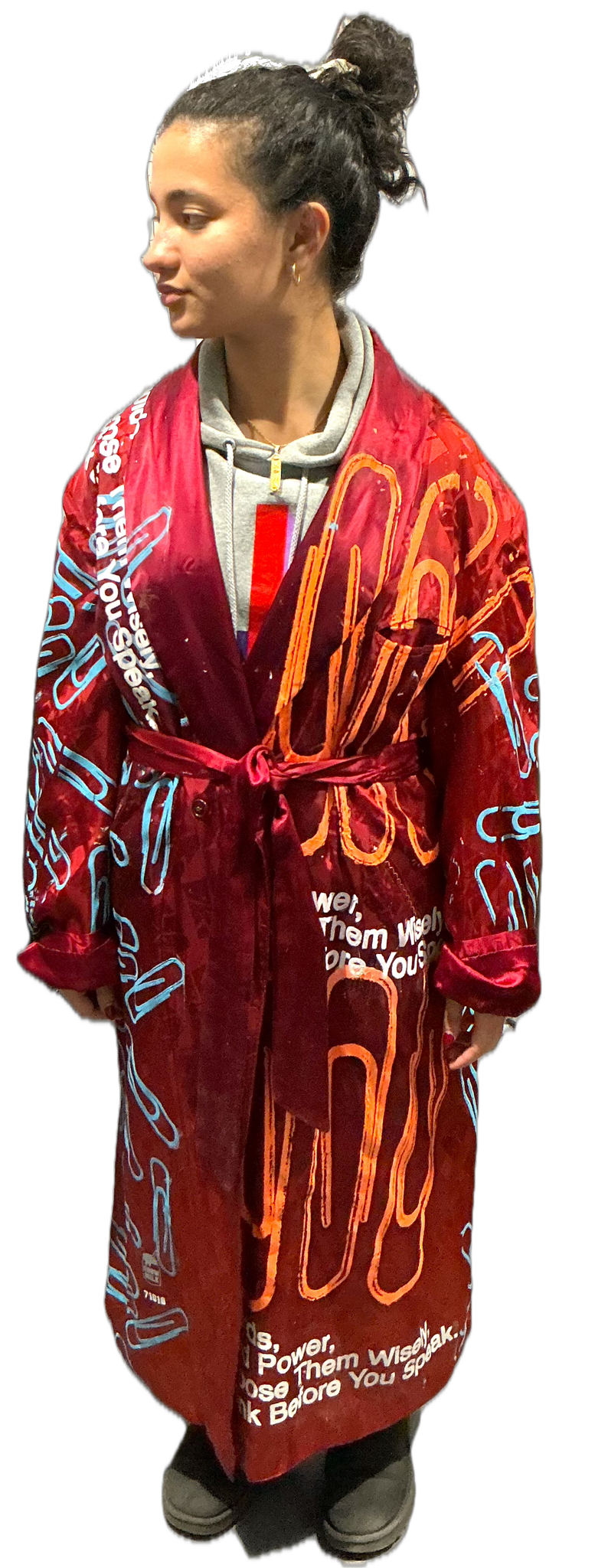 This is a one of a kind piece of clothing that has Words Hold Power printed all over the garment.