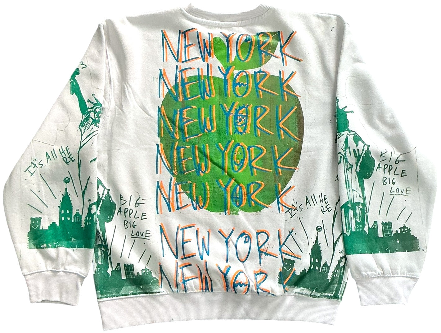 This is a one of a kind piece of thrifted clothing that has a big apple, New York, and the statue of liberty printed all over the garment.