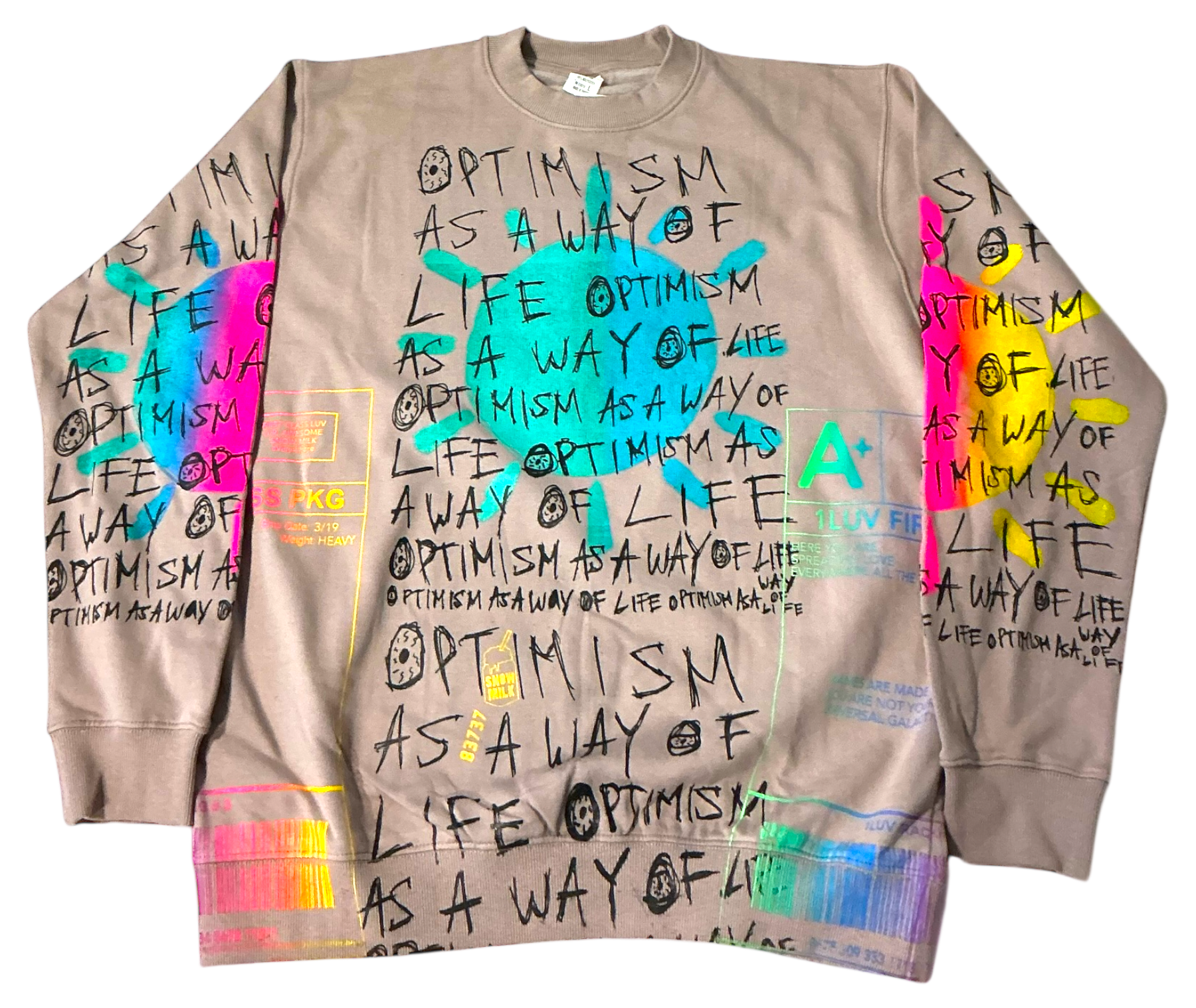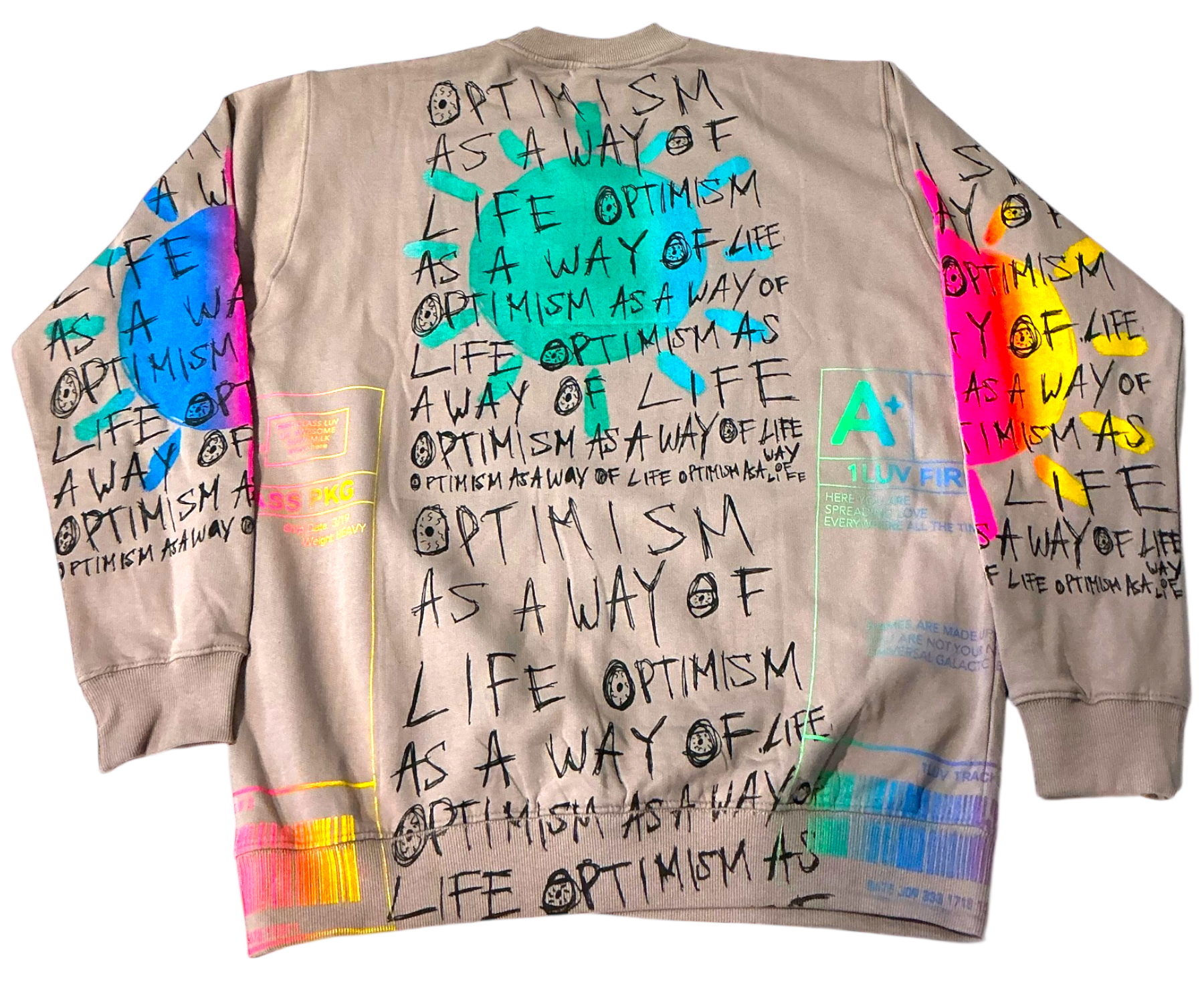 This is a one of a kind piece of clothing has a sun with optimism as a way of life printed all over.
