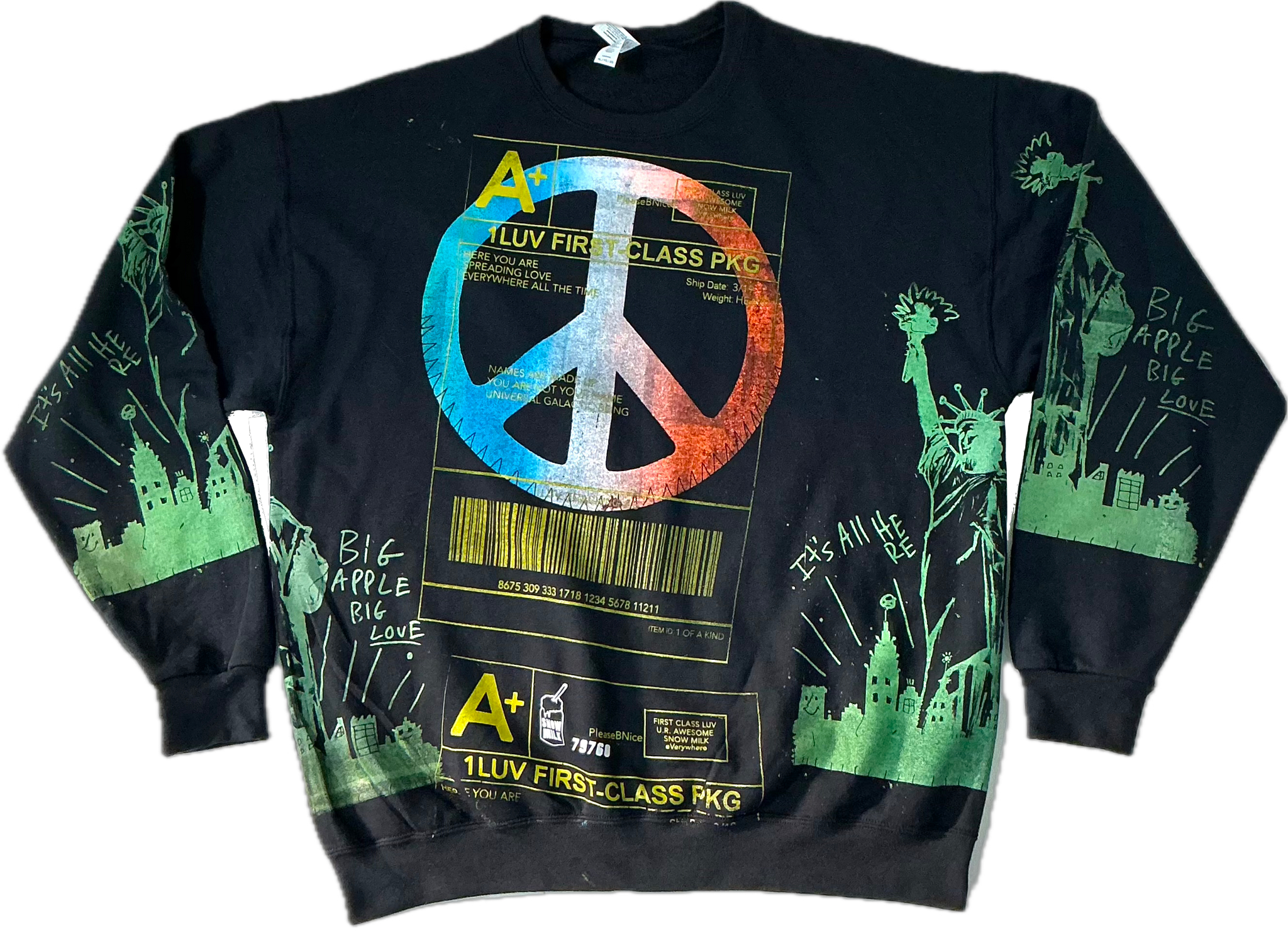 This is a one of a kind piece of clothing has peace signs, world peace and a special drawing printed all over.