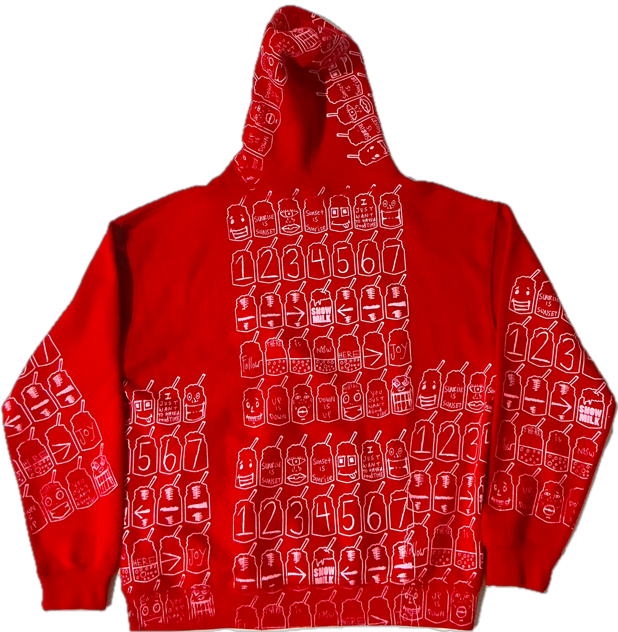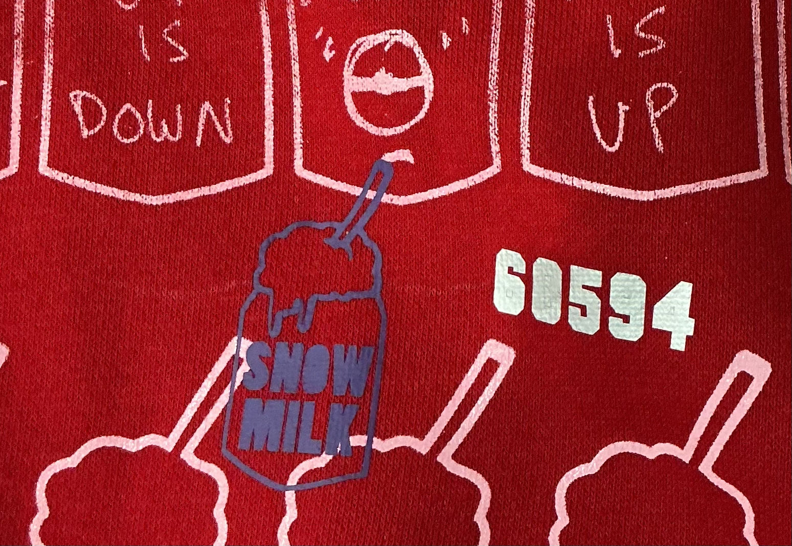 These are one of a kind pieces of clothing that have Snow Milk Cartoons & Messages printed all over the garment.